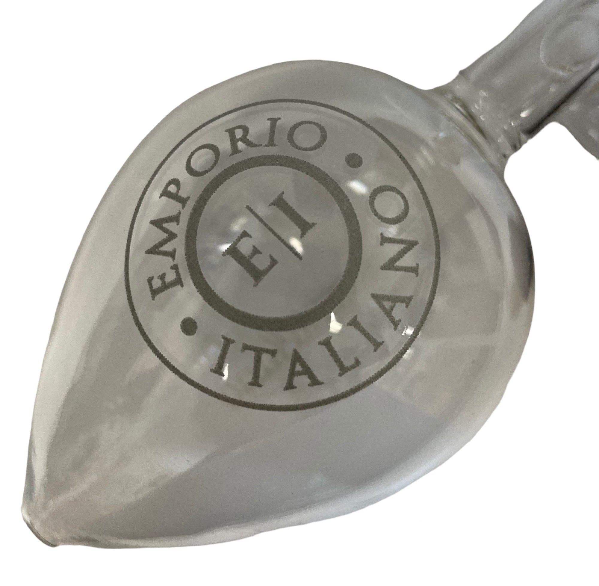 "Centellino" Wine Decanter branded with "Emporio Italiano" logo printed on glass. Size is 125 ml - 4.2 oz.