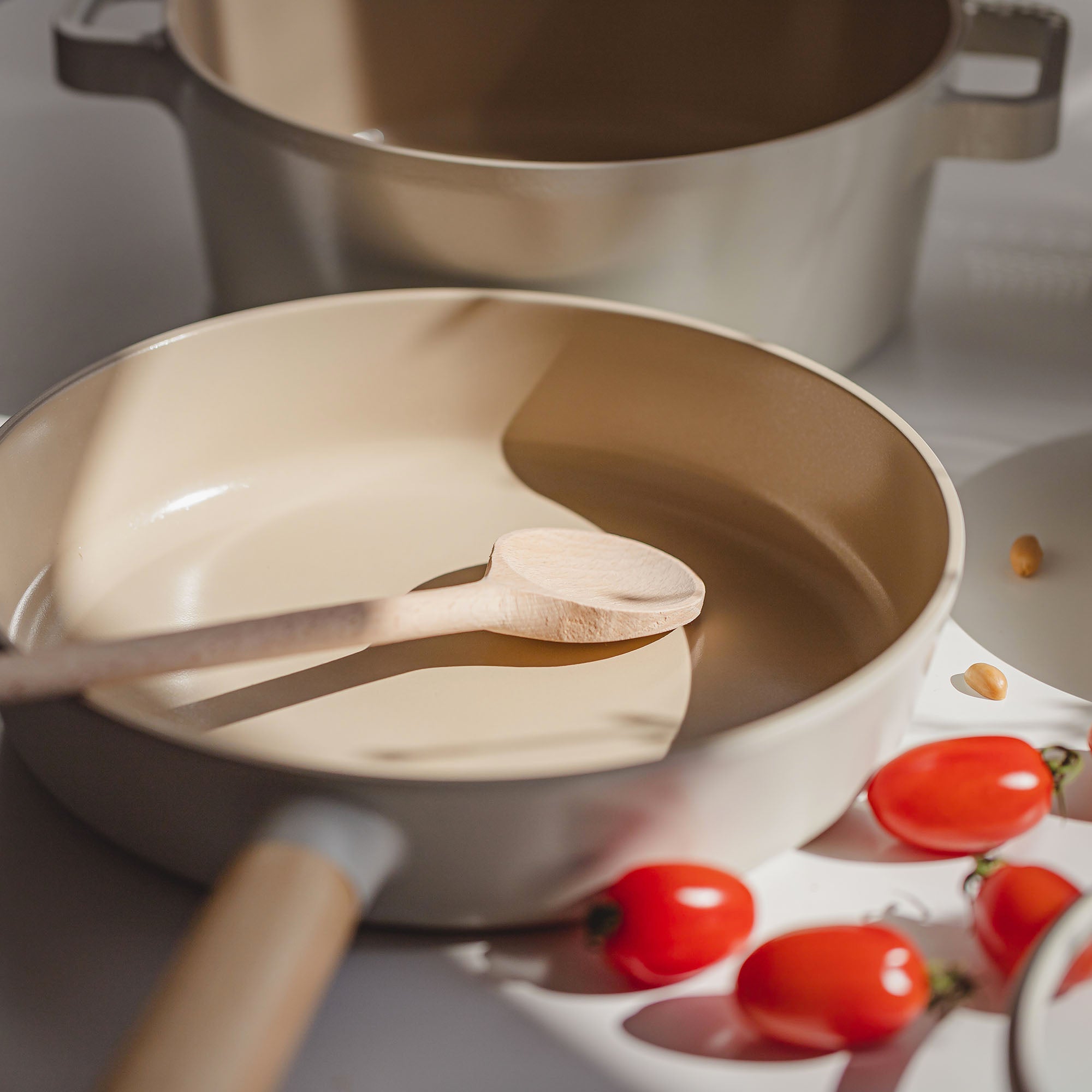 • Award-Winning Design: Scandinavian-inspired with simple round contours, matte off-white exterior, glossy sand-colored interior, and wooden handles. Silicone rimmed glass lid for precise and quiet closure.