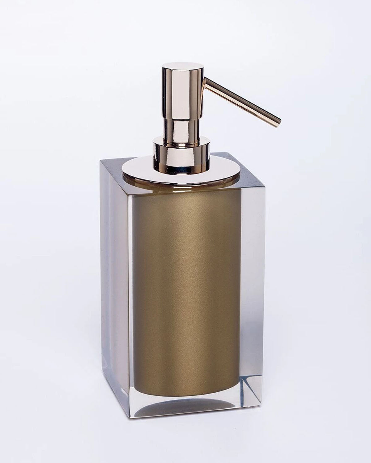 This soap dispenser is part of the Gloss Gold collection. Products from the collection have golden hues and are made with crystal resin and a gold painting metallic effect.