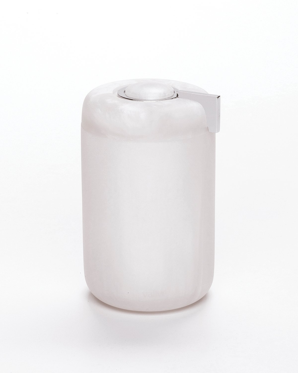 This swabs holder is part of the Botton collection. The products from the collection are vintage-inspired, with rounded and sinuous shapes. They have metallic details and same color buttons made with resin.