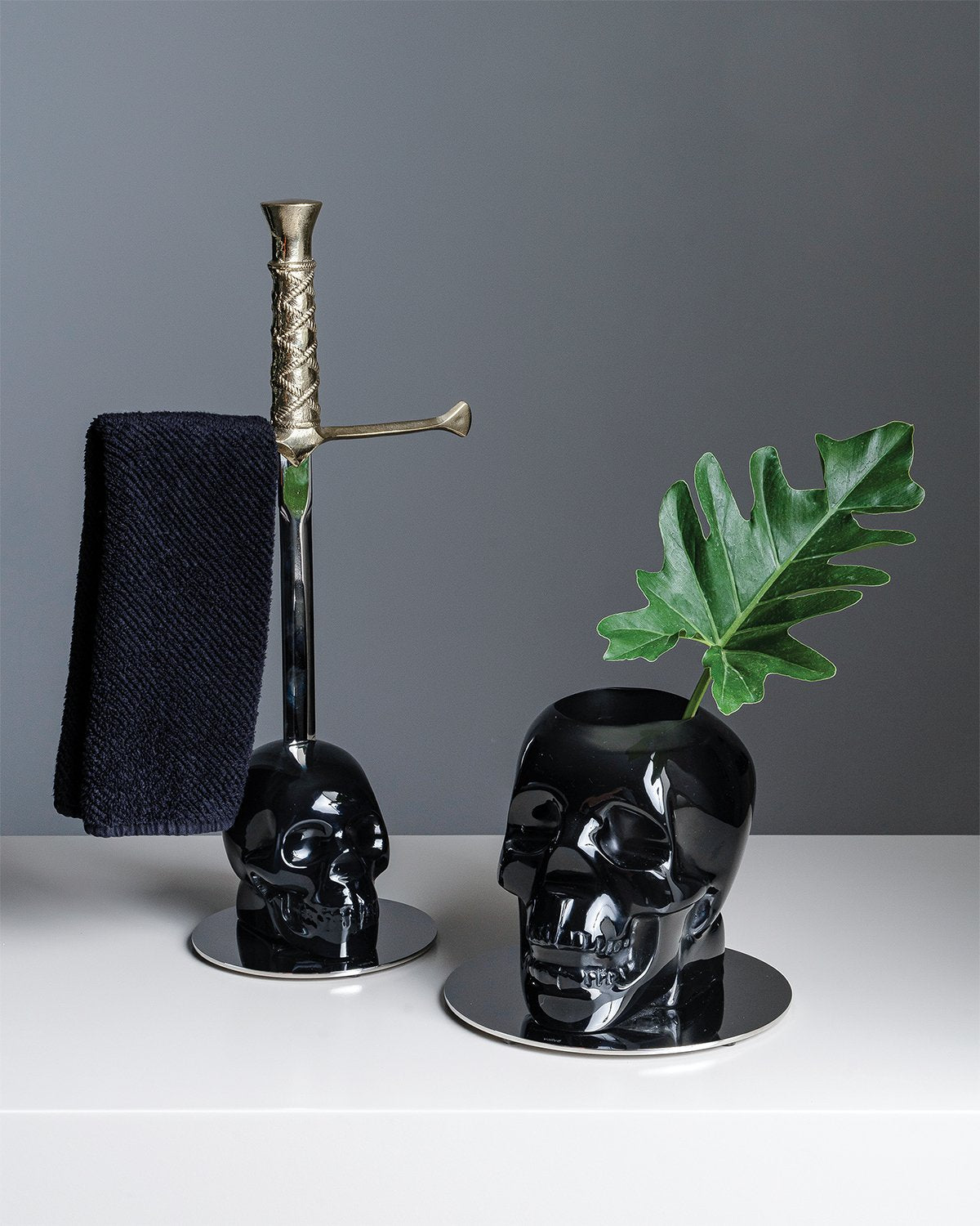This towel rack is part of the Cranium collection. All products are made of resin, stainless steel and brass, and the dynamic skull is used as a symbol of wisdom. Products are finely finished in polish and/or matte.