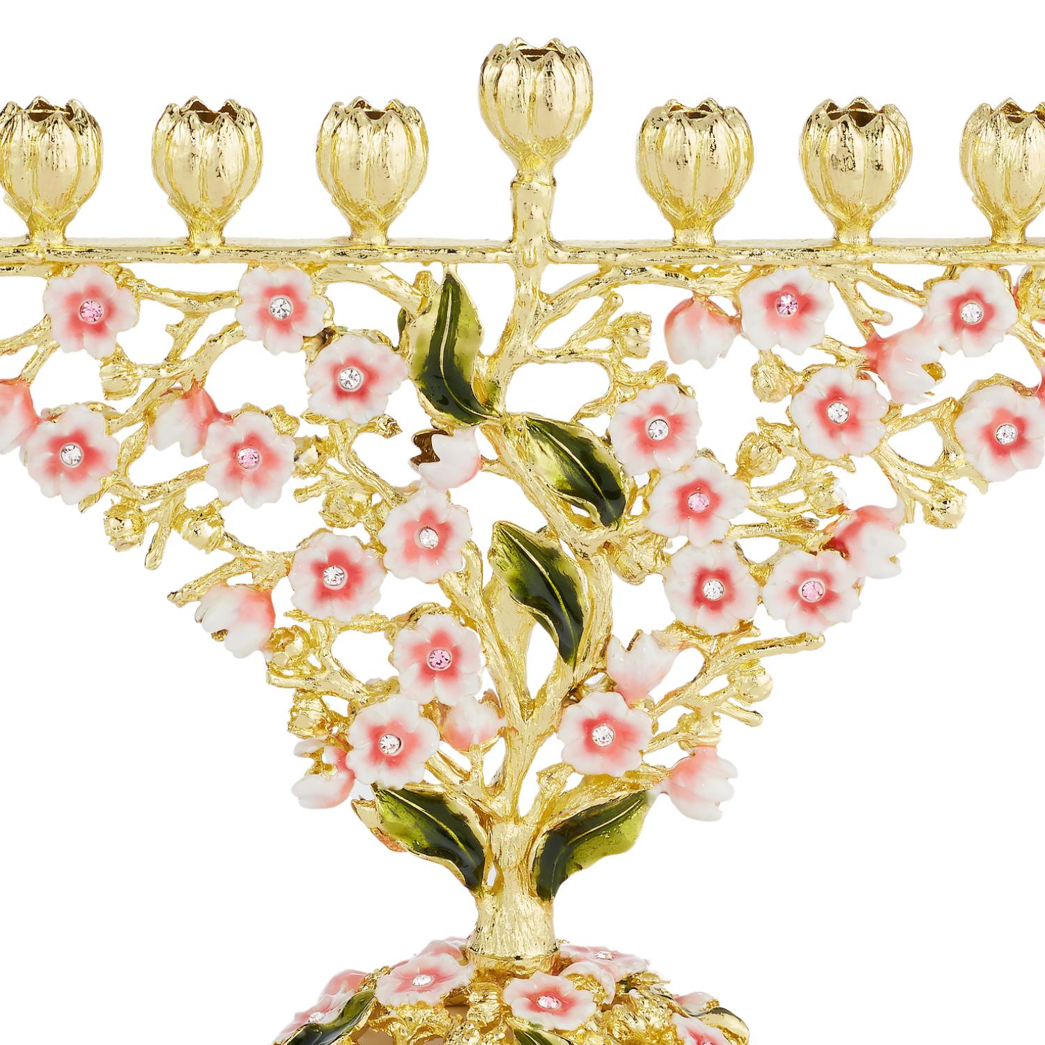 Celebrate Hanukkah with this delightful floral pattern menorah in gold finished pewter, with pink & green hued hand-enameling and hand-set European crystals. Tarnish resistant. Signature luxury gift box included.