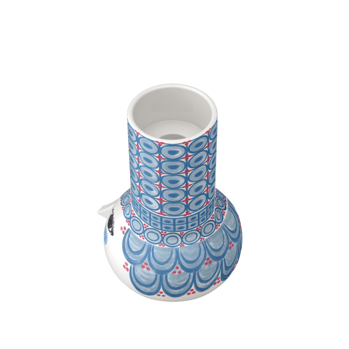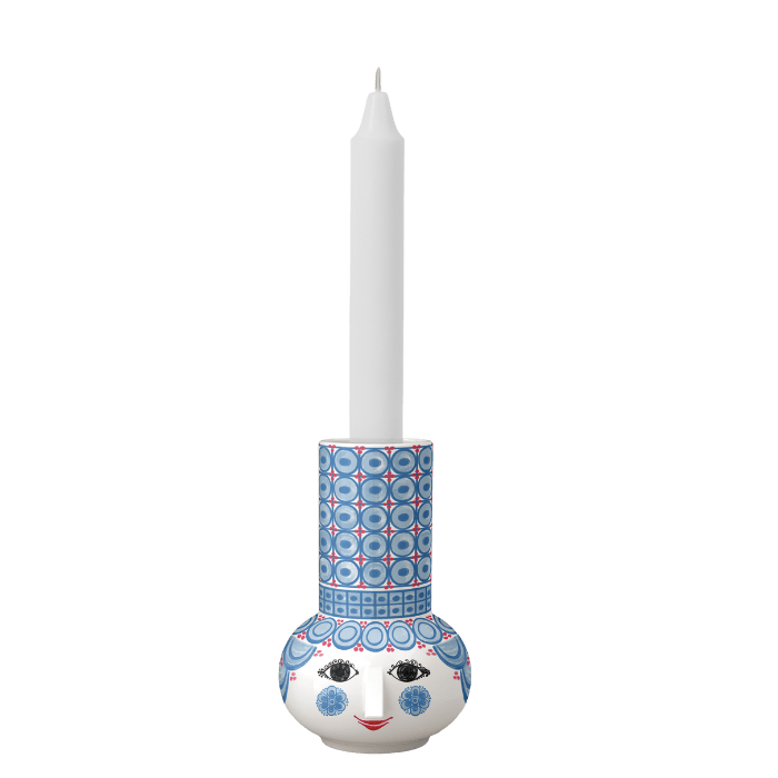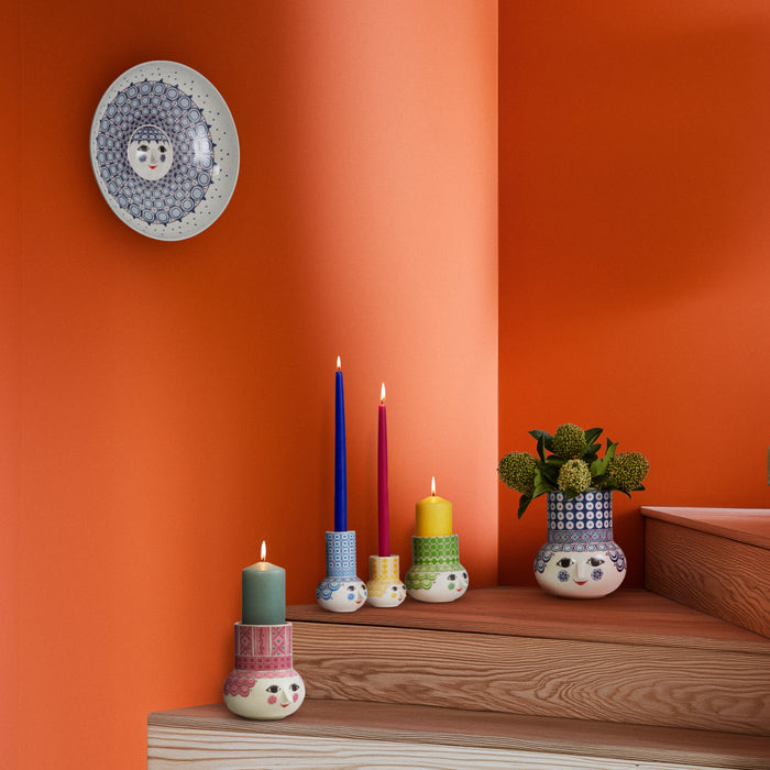 Unfold your colorful personality and add a touch of joy with Bjørn Wiinblad’s Olga. With her sweet smile, rosy cheeks, and expressive details, Olga captures the spirit of Wiinblad’s playful and poetic world. The large candle holder features the same rounded shape and cylindrical top as the Olga vases, first reimagined in 2024 from Wiinblad’s iconic designs. Standing 5.5" tall and finished in light blue with soft blue tones and pink dots, this glazed ceramic piece is designed for both tealights and taper candles. Adorned with Olga’s charming round face, almond-shaped eyes, and signature triangular nose, it brings warmth, color, and artistic flair to any space. Olga reflects Wiinblad’s joyful creativity and invites you to express your own unique style.