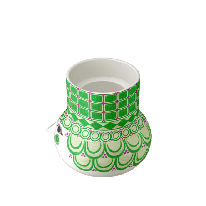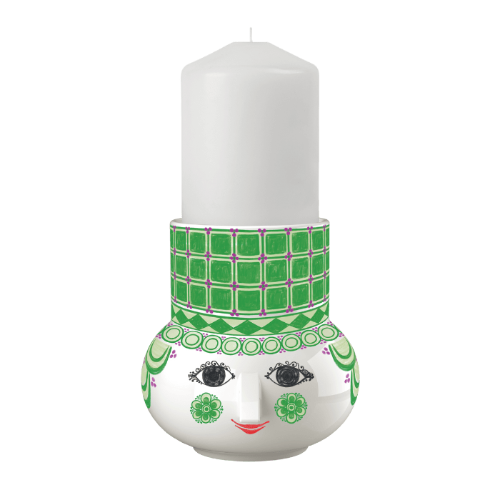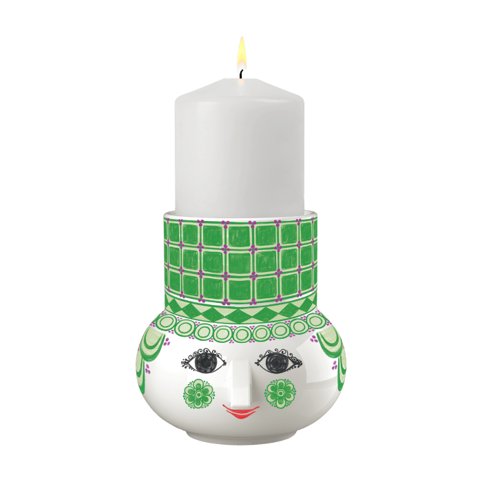 Unfold your colorful personality and add a joyful spark with Bjørn Wiinblad’s Olga. With her sweet smile, rosy cheeks, and artistic details, Olga captures the heart of Wiinblad’s creative world, even in tealight holder form. The tealight holder shares the same rounded shape and cylindrical top as the Olga vases, which were reimagined in 2024 from Wiinblad’s original designs. Standing 4.7" tall, this glossy glazed ceramic piece comes in bold light green with playful purple dots. Designed to hold tealights, taper candles, and block candles, it features Olga’s signature round face, almond-shaped eyes, and triangular nose. With colorful decals inspired by Wiinblad’s original patterns, the candle holder brings a fresh and expressive look to any space. Olga reflects the joyful spirit of her creator and encourages you to bring your own style to life.