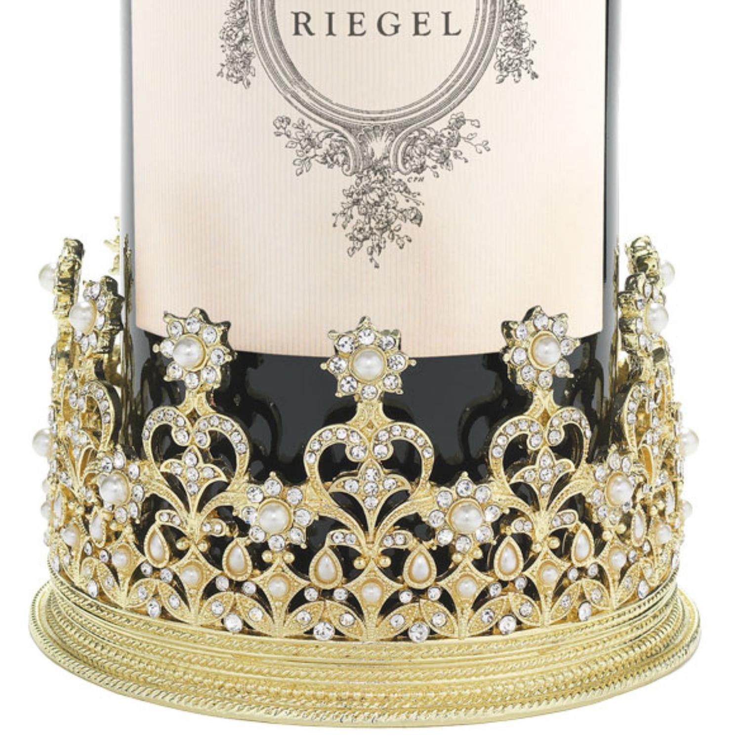 Glorious gold finished pewter crown wine coaster/candle holder, embellished with hundreds of hand-set clear European crystals and faux pearls. Celadon hued hand-enameled interior. Holds a large bottle of wine or pillar candle. Tarnish resistant. Signature luxury gift box included.