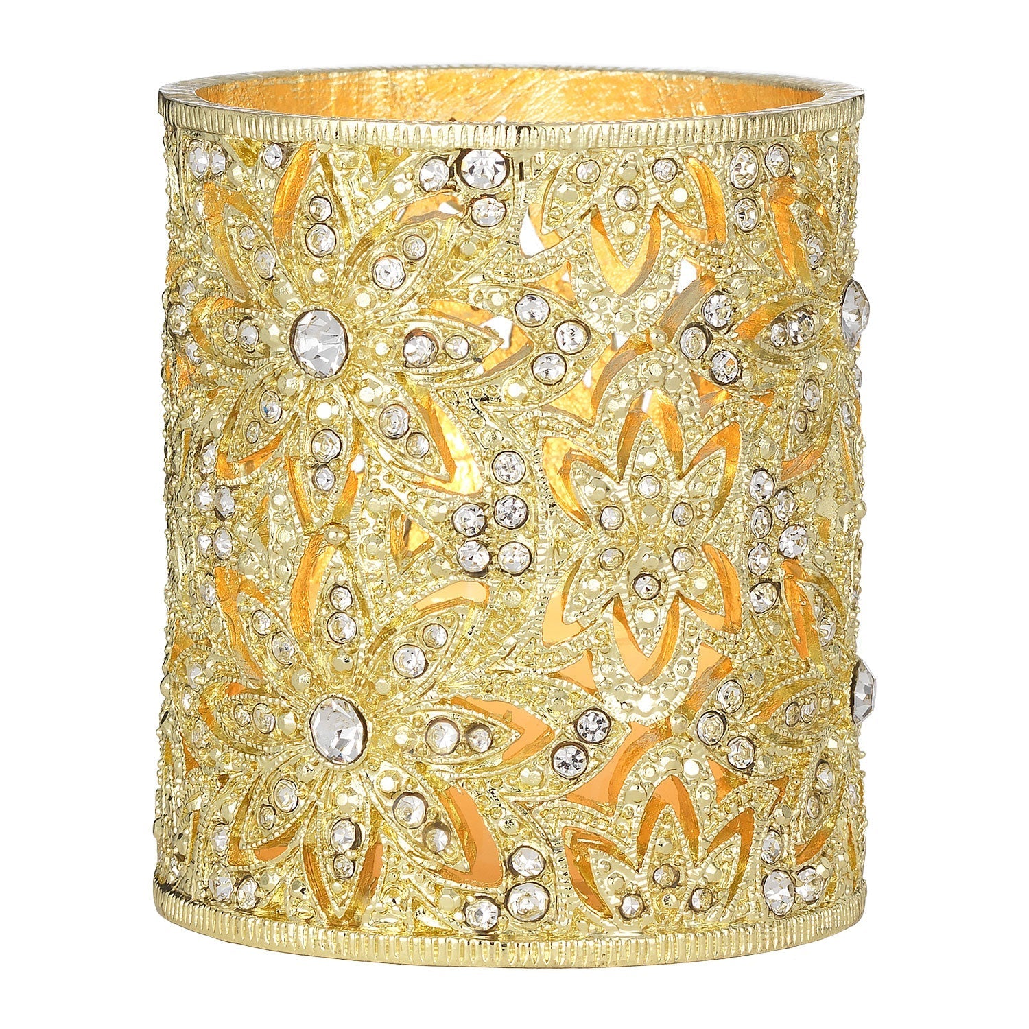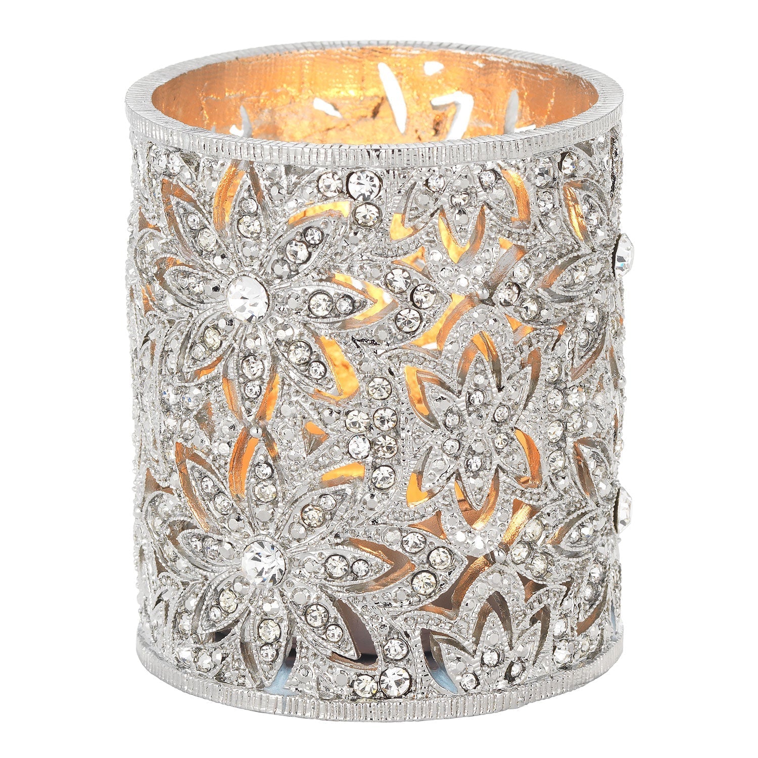 Classic estate jewelry inspired design. Silver or gold finished pewter candle holder, encrusted with hand-set clear European crystals. Hand-enameled interior. Tarnish resistant. Signature luxury gift box included.