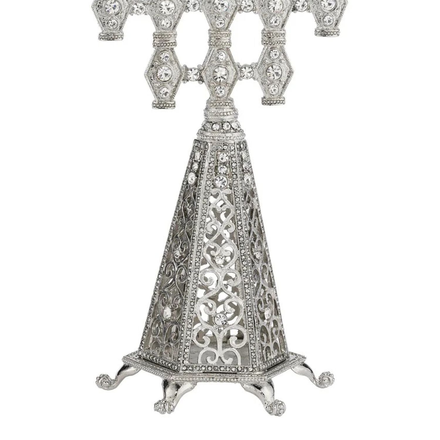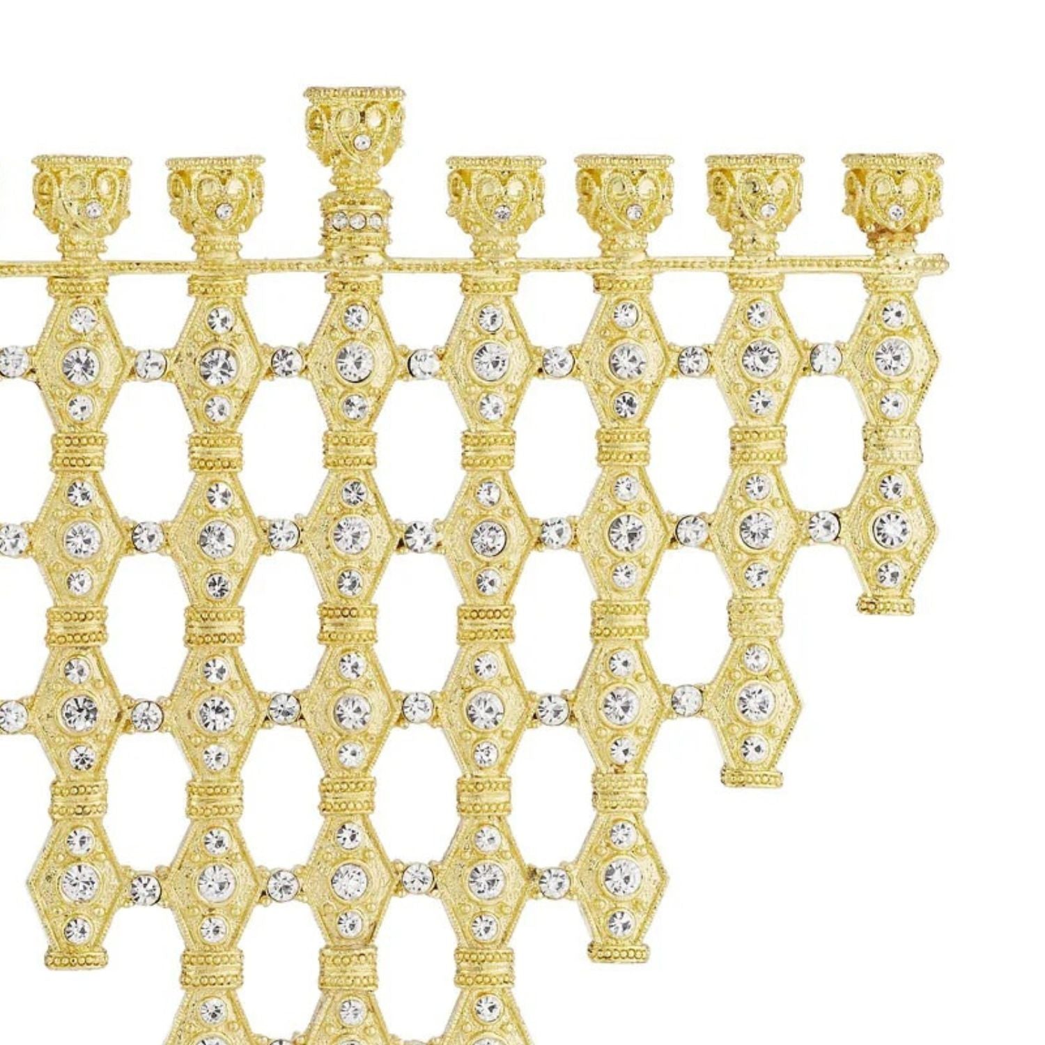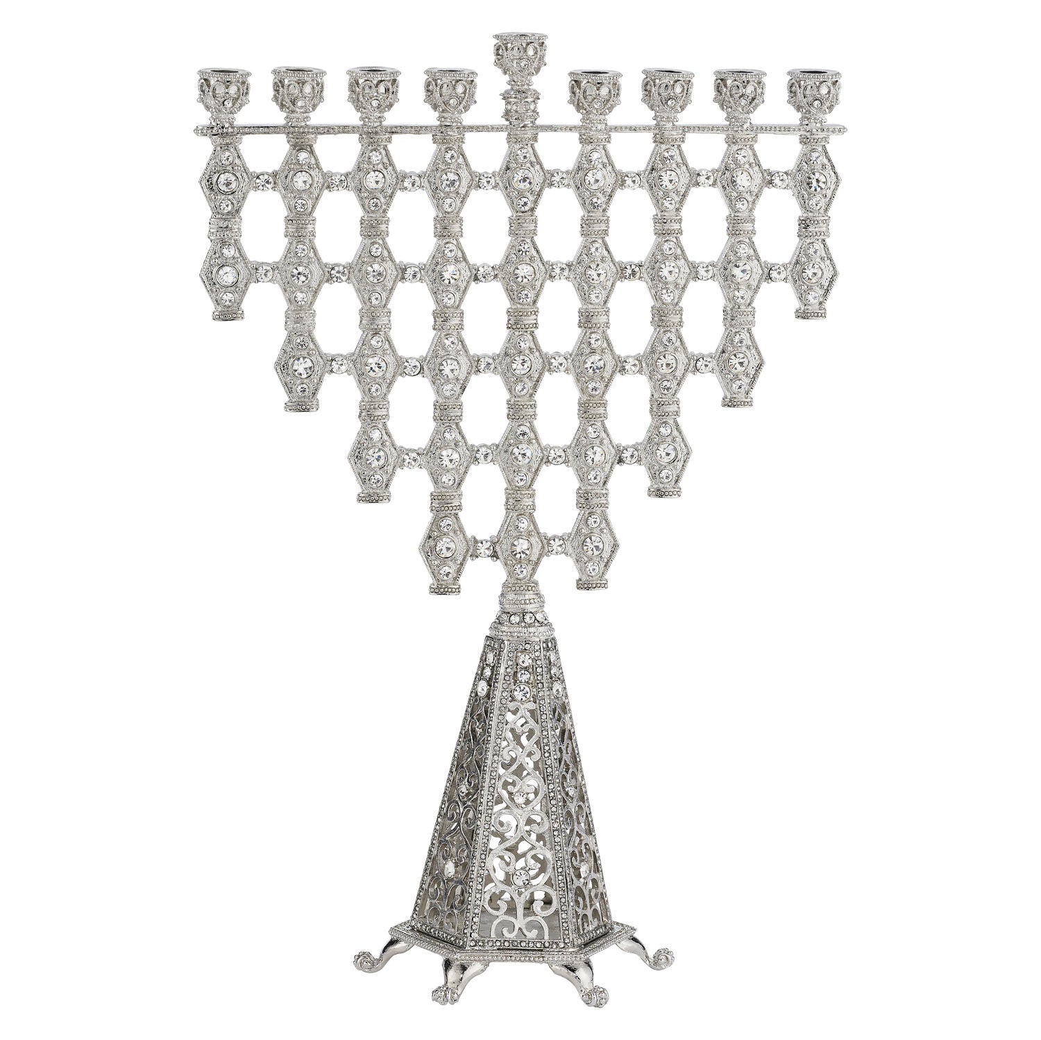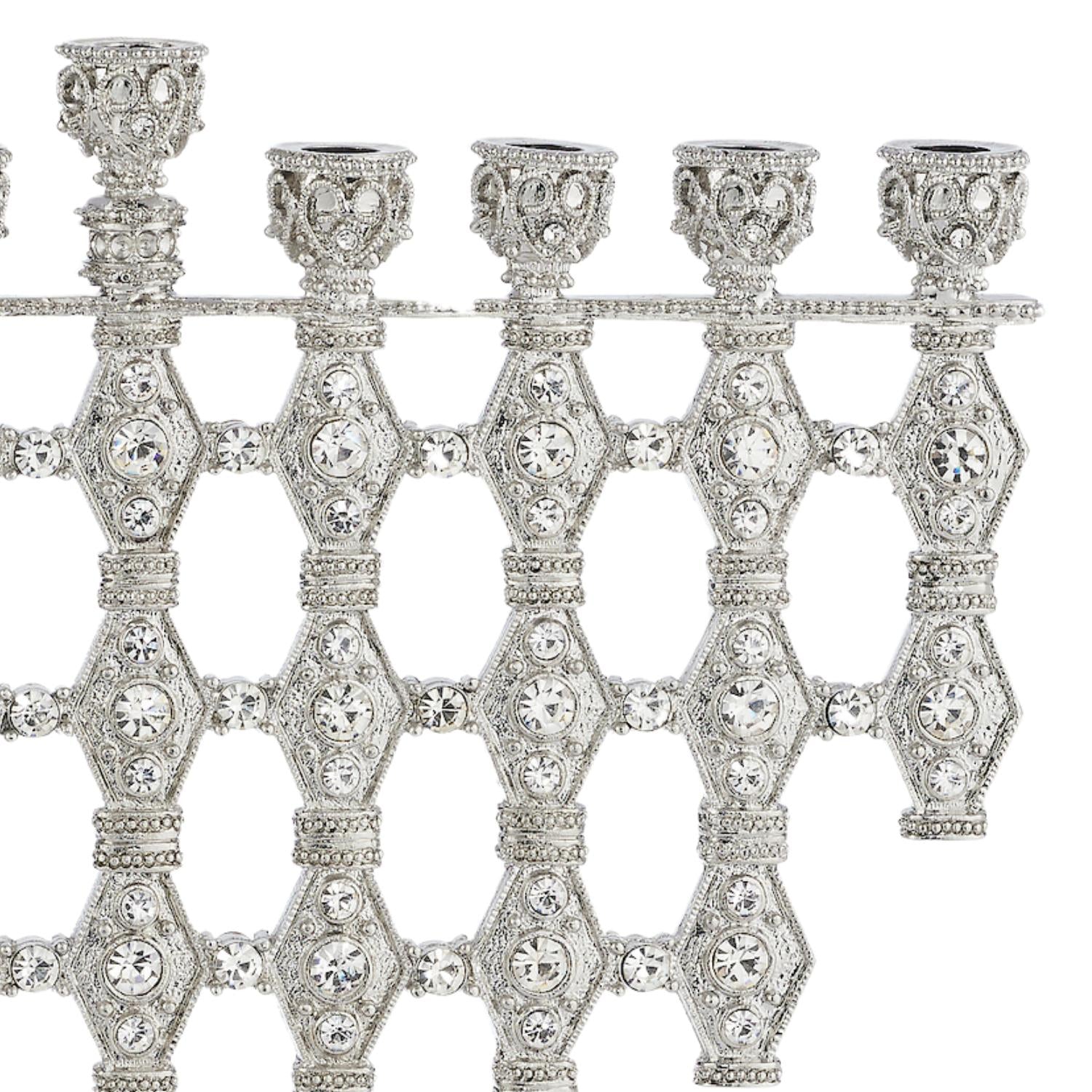 Celebrate Hanukkah with this magnificent and stately silver or gold menorah, with hand-set clear European crystals. Graceful footed base embellished with intricate filigree work. Tarnish resistant. Signature luxury gift box included.