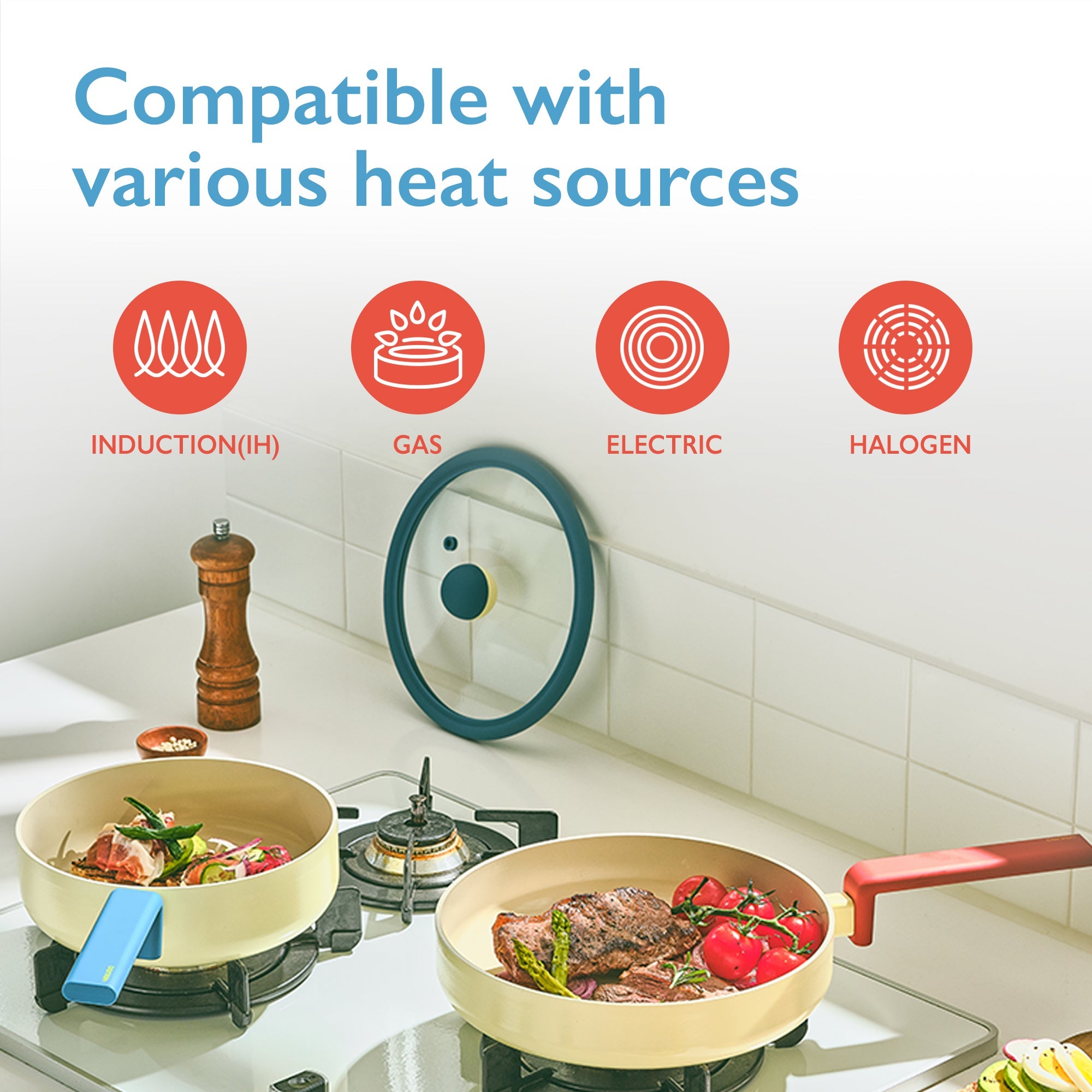 Designed with ergonomics in mind, the handles and knobs provide a comfortable grip for easy maneuvering. Compatible with induction, gas, electric, and halogen stovetops thanks to a full induction plate.