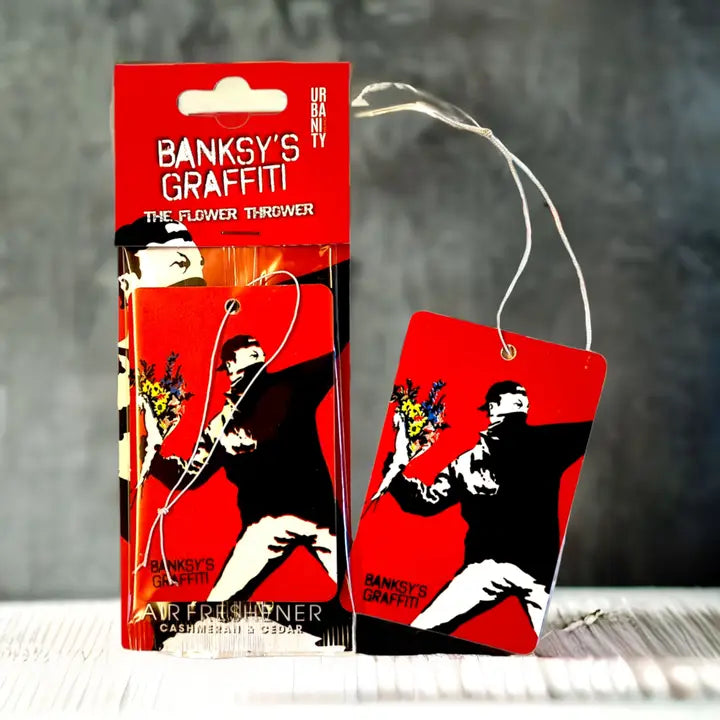 Discover the new and exclusive collection of car perfumers, dedicated to the works of Banksy, the most famous street artist in the world. The carton-felt perfumer, printed with off-set technique, is completely made in Italy and enriched by the exclusive Cashmere & Cedar fragrance, with woody tones that recall the distant Indies.