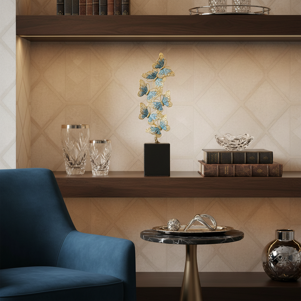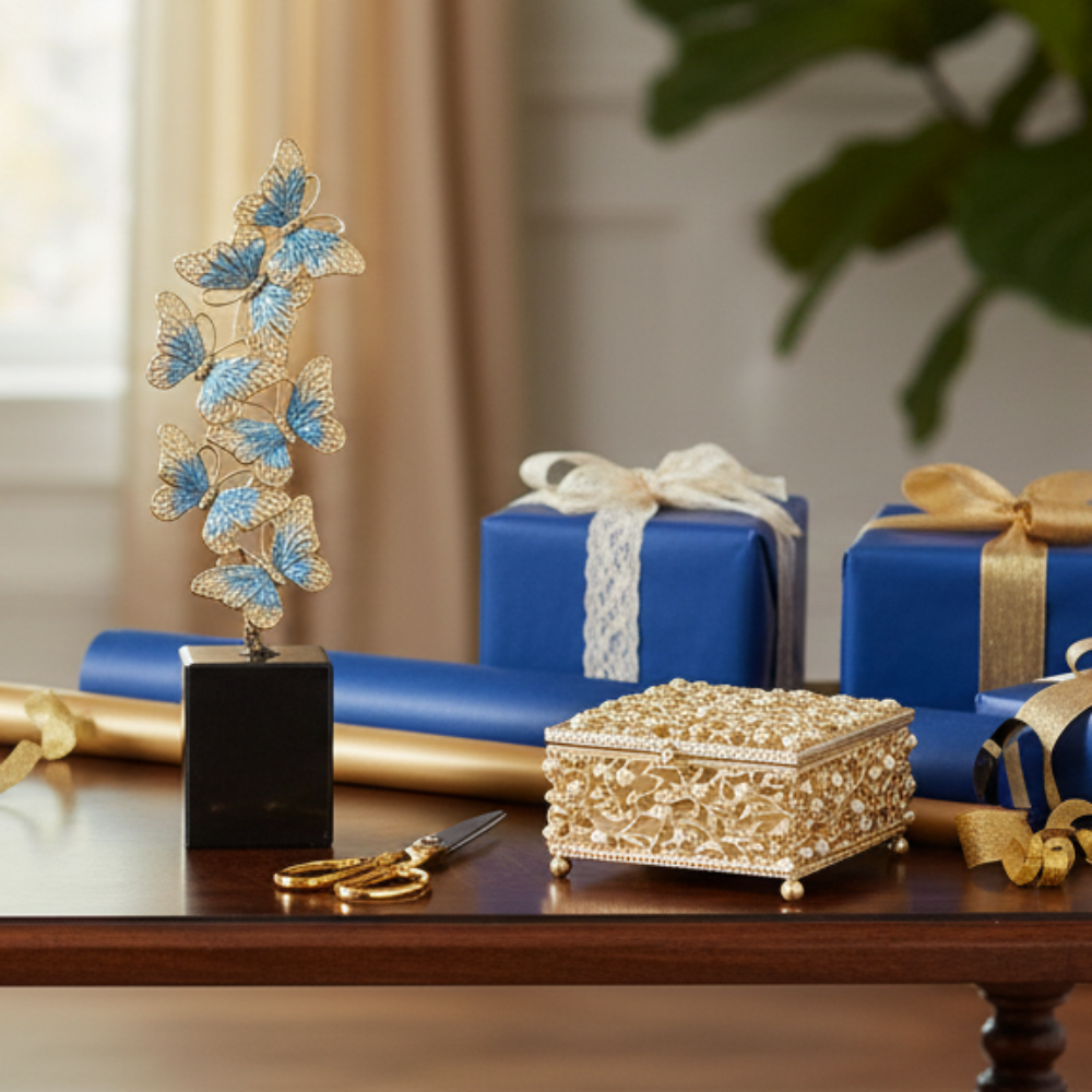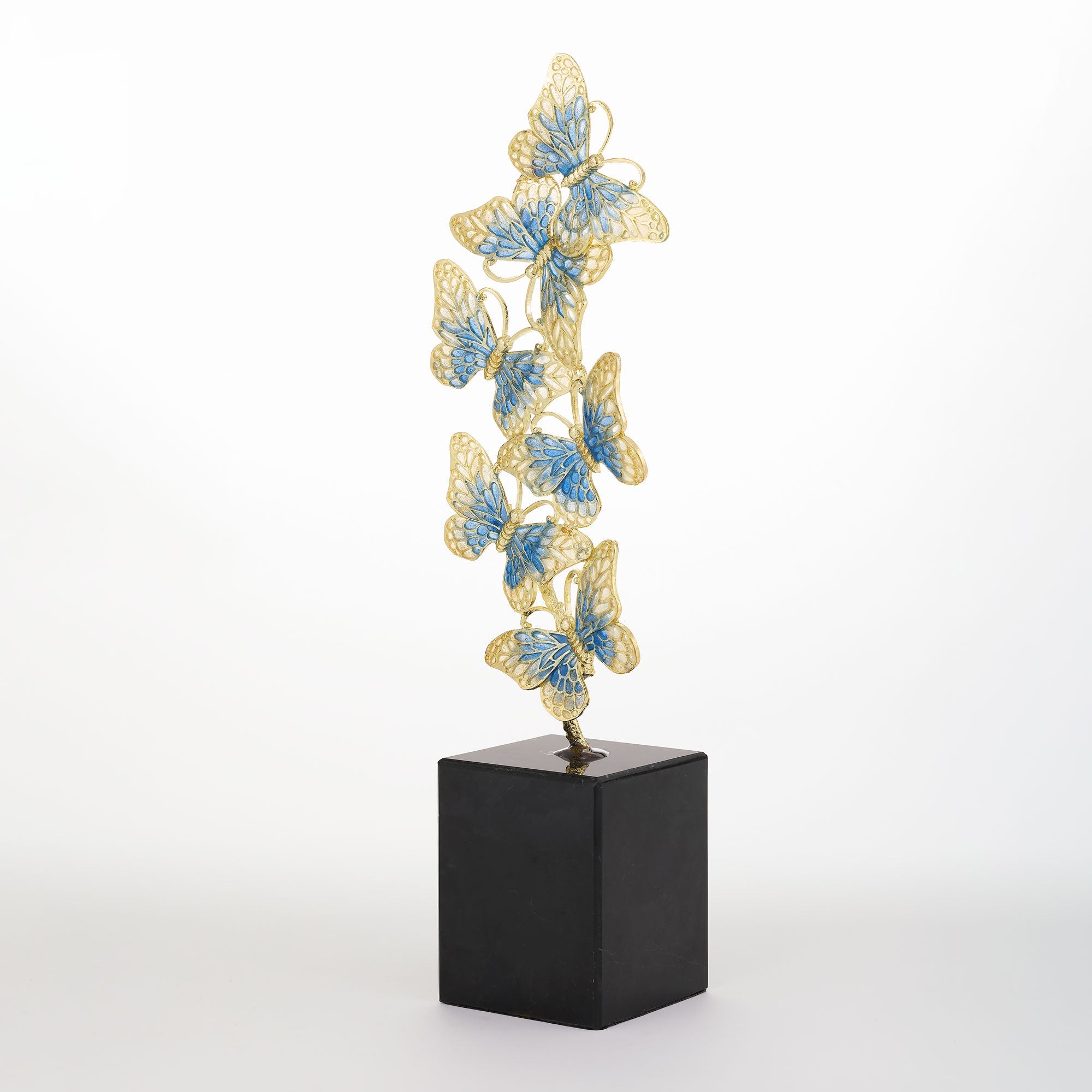 Depicting the fluttering movements of a butterfly kaleidoscope, this sculpture is richly cast by artisans in a gold finished pewter and hand-enameled in translucent cerulean blue and pearl hues. Mounted on an elegant black marble base. Tarnish resistant. Signature luxury gift box included.