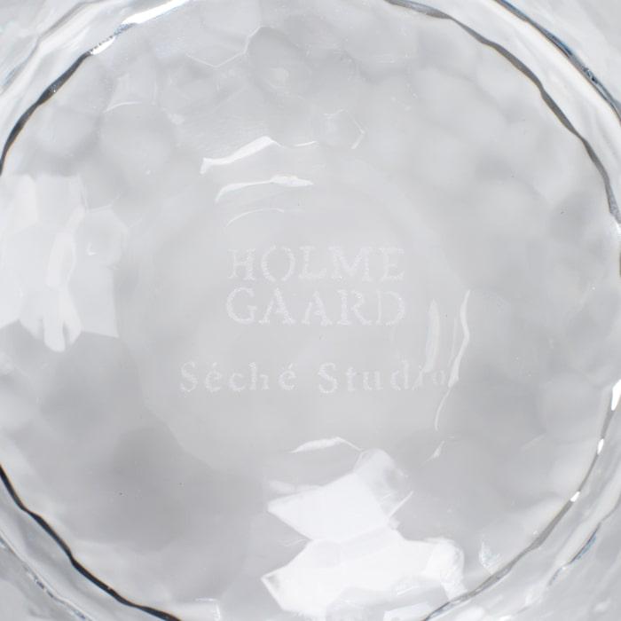 The Forma Tumbler measures 3.9 inches and is made of pressed clear glass.