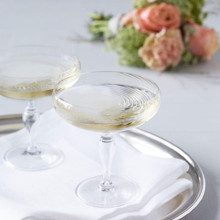 Designer Anja Kjær created the unique Regina glassware range for the Silver Wedding of the Danish Queen and Prince Consort in 1992, when the glasses were produced by Holmegaard as a gift from the Municipal Council of the City of Copenhagen. The exclusive glasses of this range are mouth-blown, and each Holmegaard champagne glass in the Regina range is unique. Our Regina champagne glass goes well on the dining table with other glasses from the same range, to create a stylish table setting complete with champagne glasses by Holmegaard.