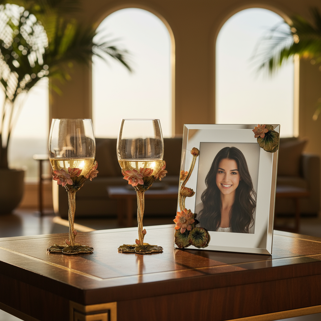 Honoring the beauty and purity of the lotus blossom. Gold finished pewter wine glass featuring lotus blossoms and leaves, intricately hand-enameled in soft pink and green hues. Hand-set clear European crystals. Tarnish resistant. Signature luxury gift box included.