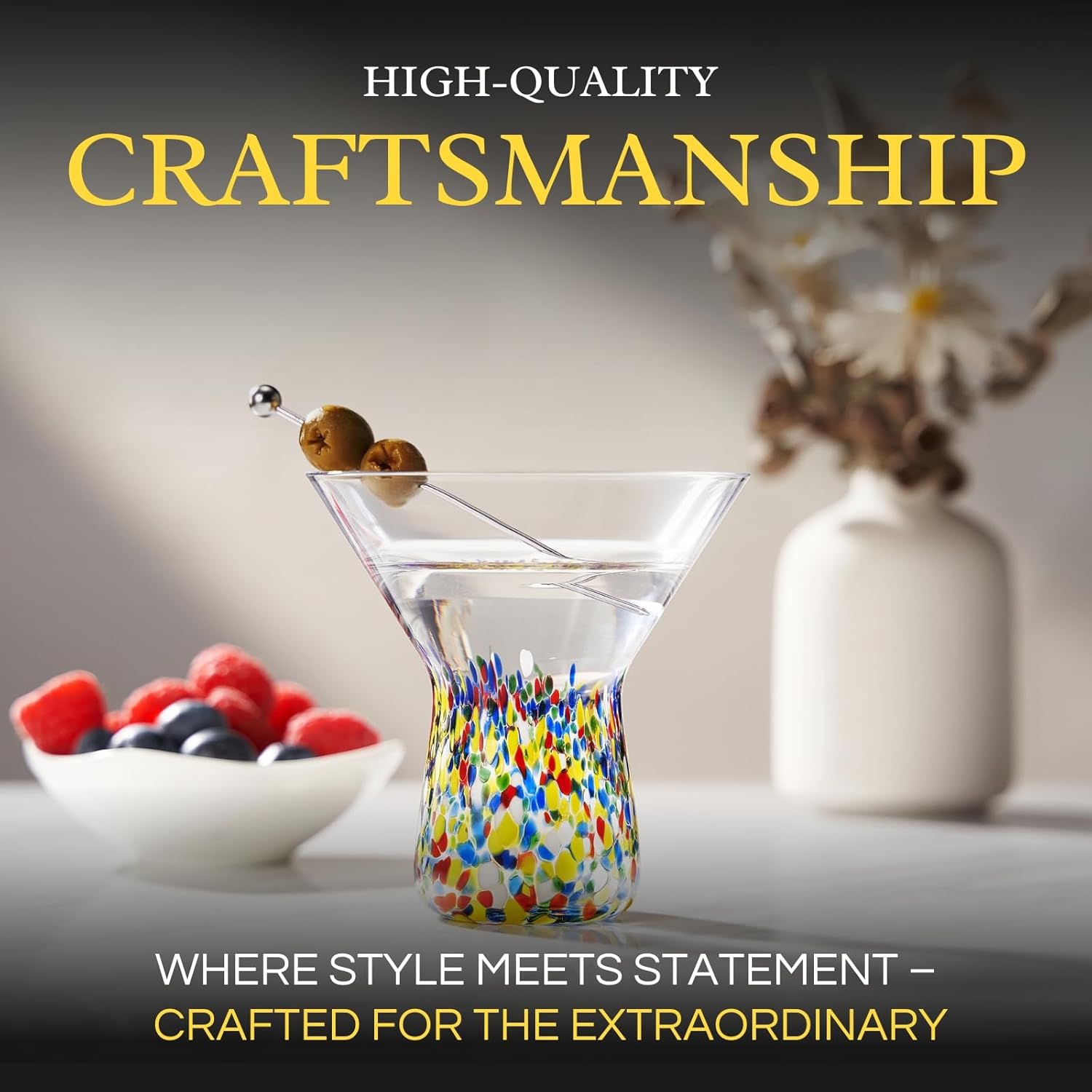 Elevate your drinkware collection with these hand blown Mexican martini glasses, featuring a vibrant confetti design that blends artistic flair with festive charm. Each stemless glass is handcrafted by skilled artisans, making it a unique addition to your barware or kitchen. Perfect for cocktails, margaritas, champagne, water, wine, or dessert, these durable and reusable glasses offer modern comfort with their elegant shape and stable base. The colorful pattern adds a bold aesthetic to parties or everyday use, making them as decorative as they are functional. Whether for entertaining or gifting, this collectible set is a standout piece of tableware that brings beauty, culture, and versatility to any celebration.