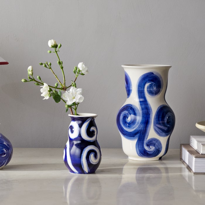 The largest of the Tulle vases, this 8.9" tall vase has a cream-white base color and is decorated with blue swirls, which have then been glazed. Here, the brush strokes are clear, organic and natural and help give the vase a unique look. The vase has a beautiful authentic and artistic look in a modern context and has been given extra depth and life through deep, rich glazes, which originated in the old Kähler workshop.