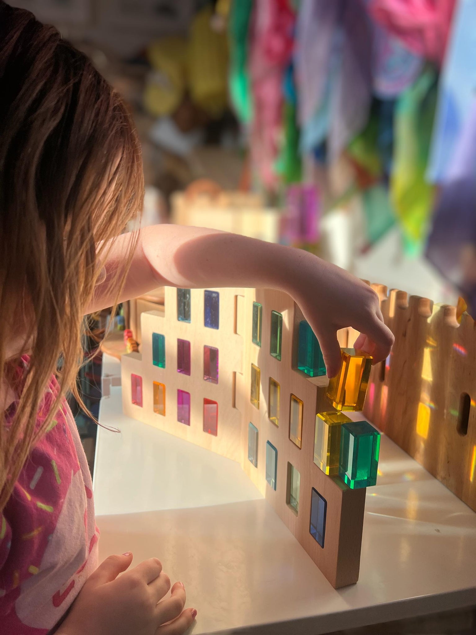 Each block is 2 inches tall and weighted for a satisfying, sturdy feel—perfect for small hands developing fine motor skills and spatial awareness. Their clarity and brilliance transform play into a magical sensory experience, whether used in natural daylight or with a light table.