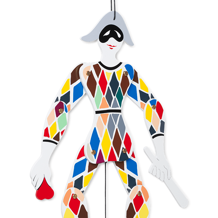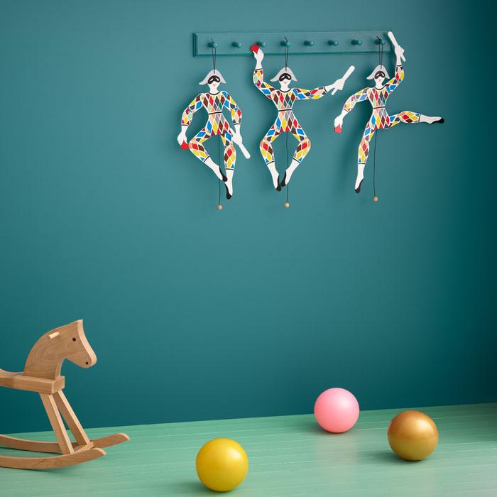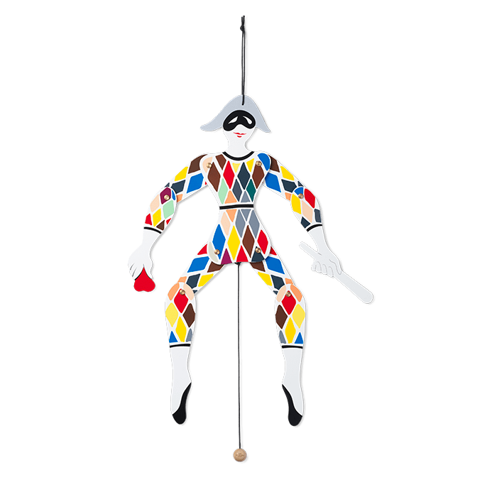 Harlequin and Columbine are two of the main characters in the old Italian popular comedy, commedia dell'arte. Enjoy this wonderful Harlequin Jumping Jack from Kay Bojesen in painted beech. Hang Harlequin up and let him dance as he thinks about his beloved Columbine. The Kay Bojesen Harlequin Jumping Jack has movable arms and legs fitted on cords.