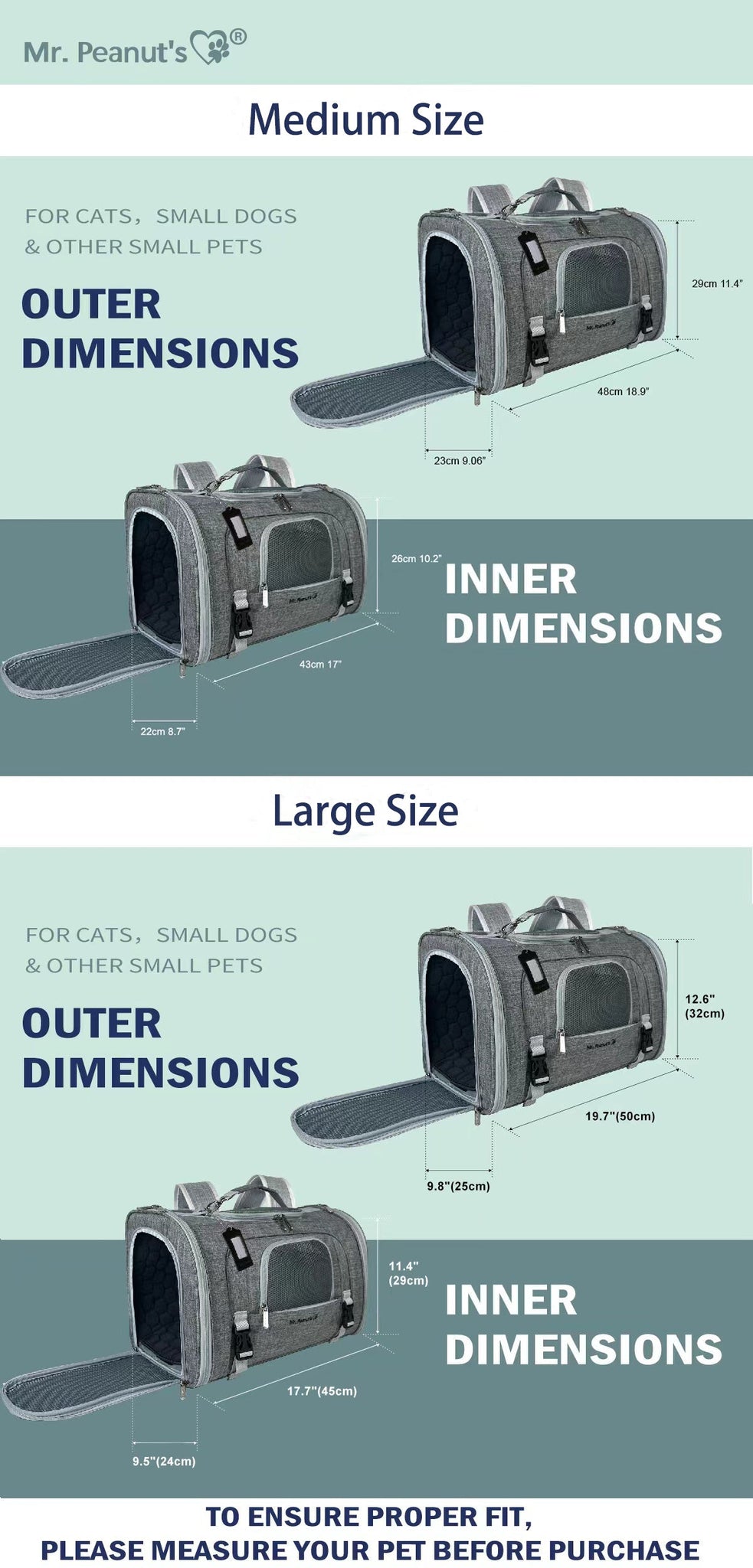 HOW TO MEASURE YOUR PET - I always recommend to measure your pet while comfortably laying down as this is the typical position during flight time. Keep in mind all of my airline approved totes are designed with pet safety and comfort as the priority, and then by airline under seat requirements, so sizing is limited by that criteria. I know it’s sometimes difficult to size based on measurement or images. I make every effort to keep pricing as low as possible so that anyone can afford a safe and comfortable carrier for their pet, so please make every effort to properly measure your pet before ordering. The postage cost for a return is an average of $14 for the USA, and that is very difficult for a small business to bear. In addition to the sizing guidelines and images shown here, many users have found it helpful to view the Instagram feed, @mrpeanutspetcarriers, where there are contributions with pets of every size and in every model.