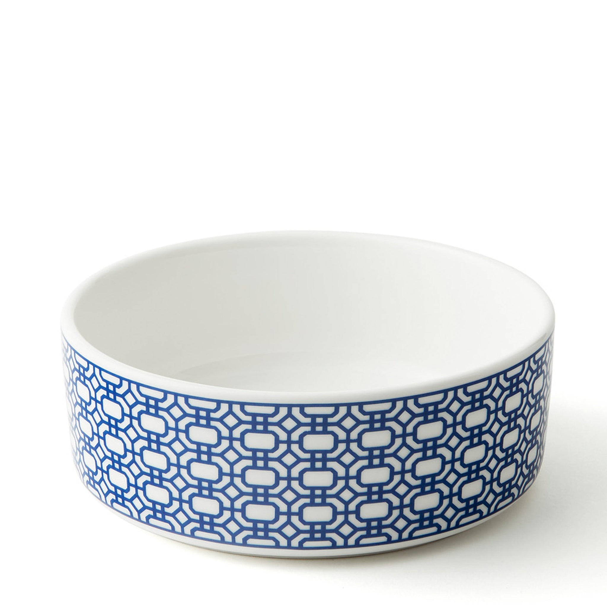 Newport Garden Gate features an interlocking lattice pattern in saturated color on creamy white premium porcelain.