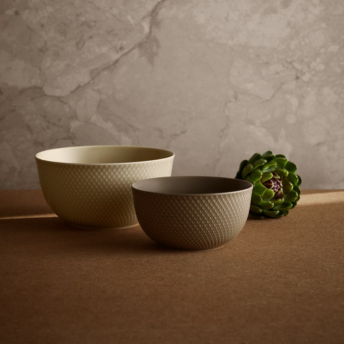 Rhombe Earth brings an earthy, harmonious touch to your table with four elegant shades — Marble, Clay, Moss, and Slate. Designed to encourage mindfulness in dining, this collection highlights the beauty of tableware while enhancing the experience of sharing meals. The Marble shade, like the others, accentuates the Rhombe series' iconic relief pattern, inviting a deeper sensory connection to food and conversation. This serving bowl measures 8.7" in diameter. Curated by design duo Stilleben, Rhombe Earth seamlessly blends with the Rhombe Color series and classic white Rhombe pieces. Plates, mugs, and bowls can be mixed and matched, stacking in warm, muted tones for a modern yet casual look. Whether used alone or combined, these earthy hues create a striking contrast against crisp white porcelain, adding effortless elegance to any setting.
