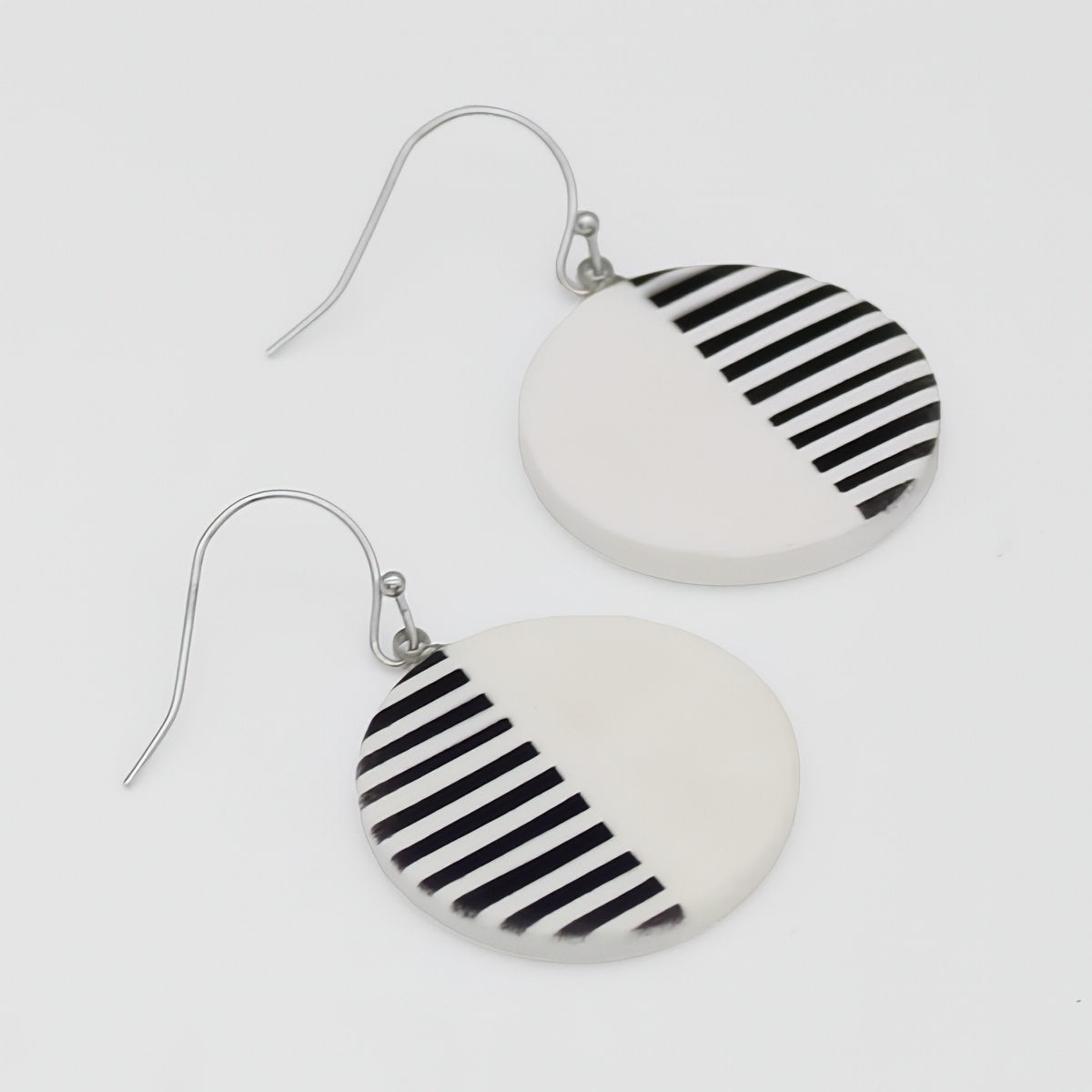 Elevate your style with our White Harlowe Striped Earrings. These round disc earrings feature a hand-painted white and black stripe design, adding a touch of sophistication to any look. With their light weight and versatile style, they effortlessly dangle and are perfect for any occasion.
