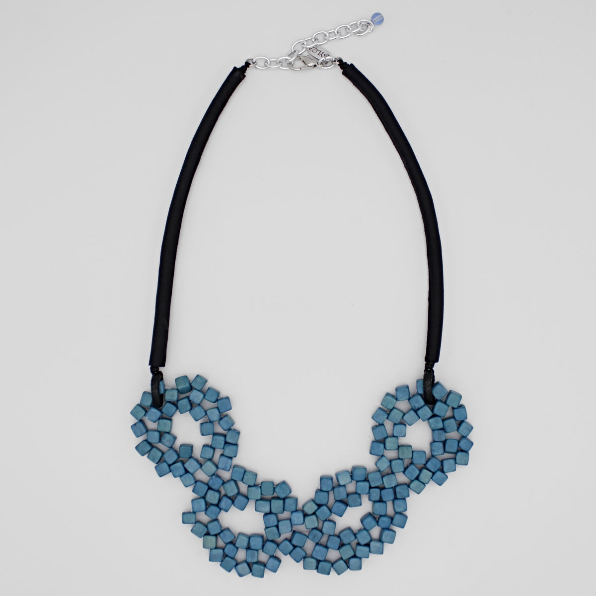 A uniquely crafted abstract necklace. Designed as very lightweight adjustable necklace on a wax cord, this beauty will make a lovely statement. Tiny (6 mm) square ocean blue beads cluster together to create this necklace design. Hooked onto black tubing and finished with a 2” adjustable clasp; layer this necklace over a solid tee or dress paired with the matching earrings.