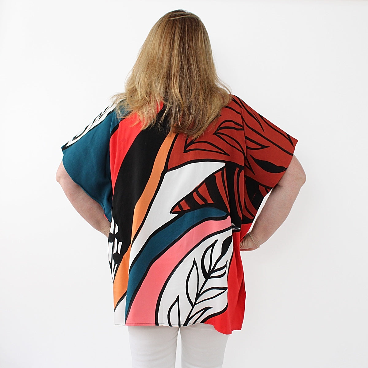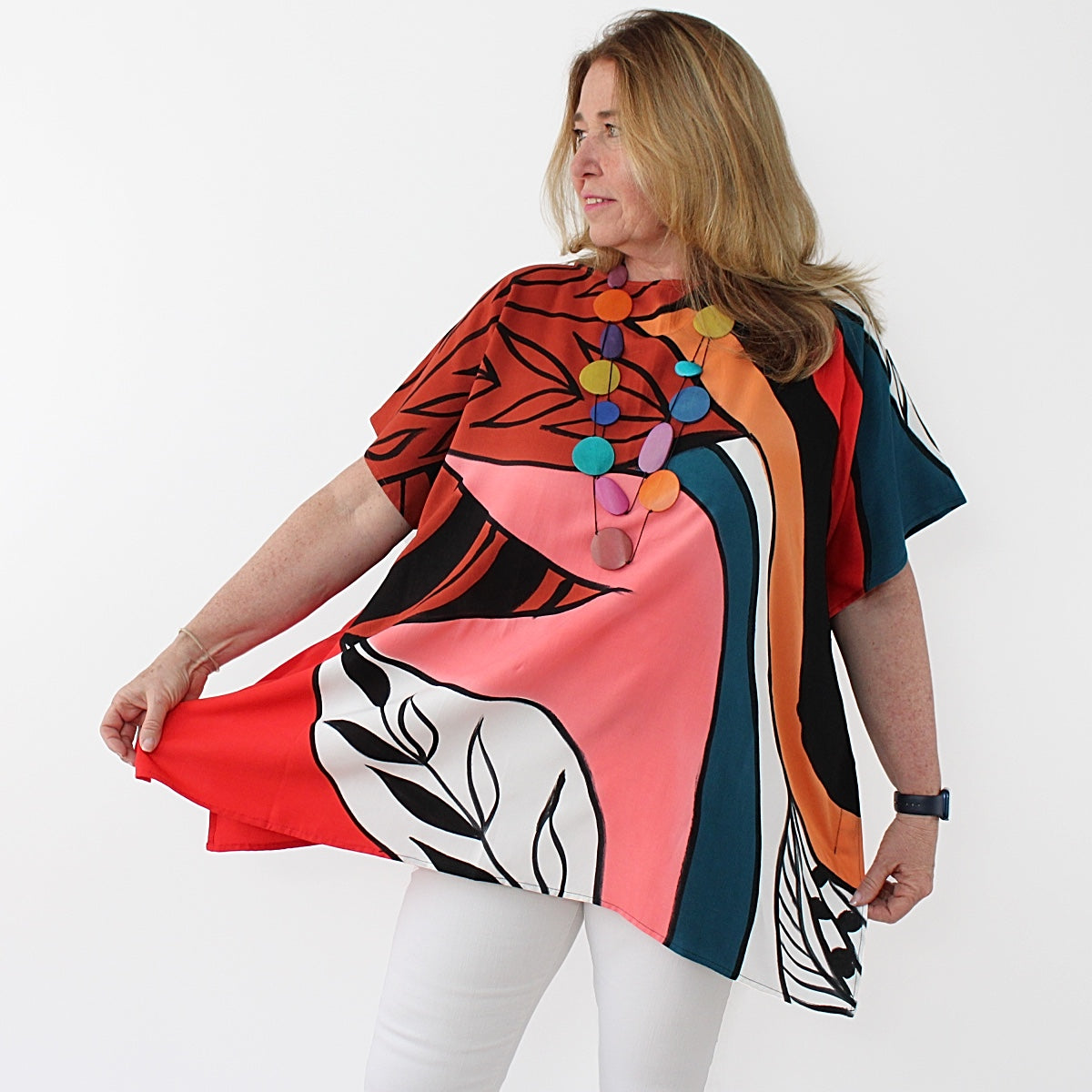 Truly a wearable piece of art; this one-of-a-kind blouse features a hand painted design featuring colors such as red, pink, teal, and white. Made of rayon, the loose fitting short sleeves, a wide neckline, and a relaxed fit for all year round. Wear this shirt with your favorite Sylca necklace and head over for a great night out!