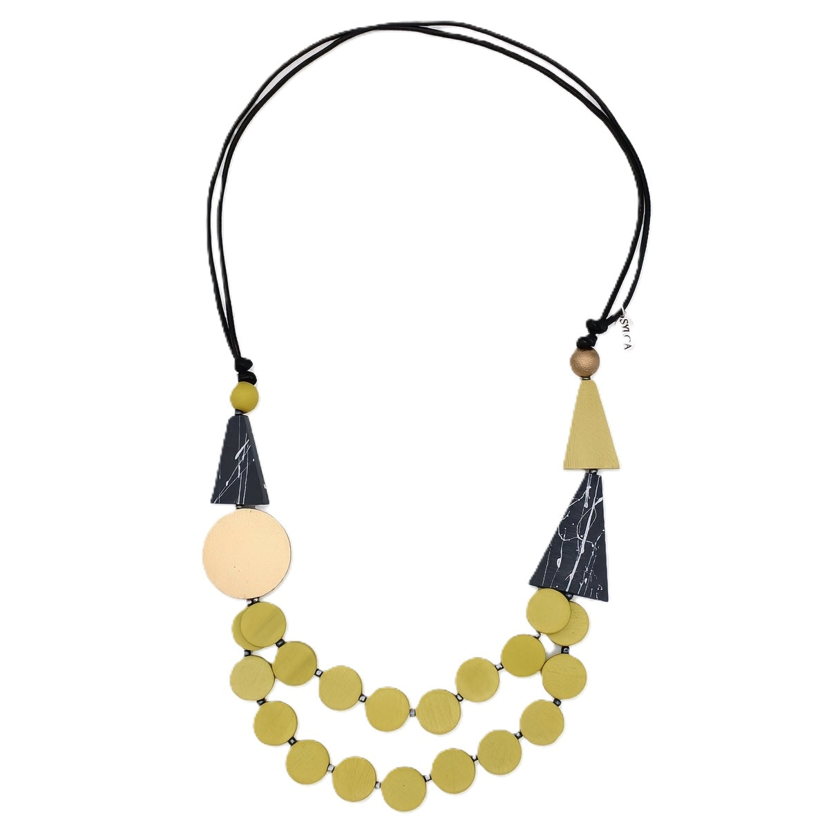 Make a dramatic impression with Scarlett, a captivating yellow and gold multi-strand necklace that combines bold geometric elements with layered sophistication. This contemporary art jewelry piece features an artistic blend of circular and angular shapes for the confident woman who loves to make a statement.