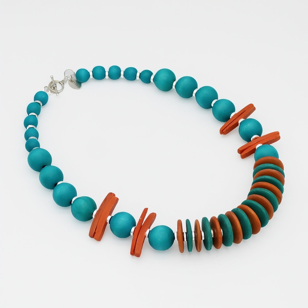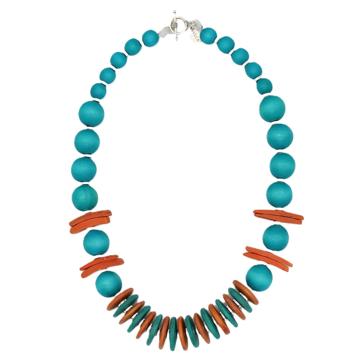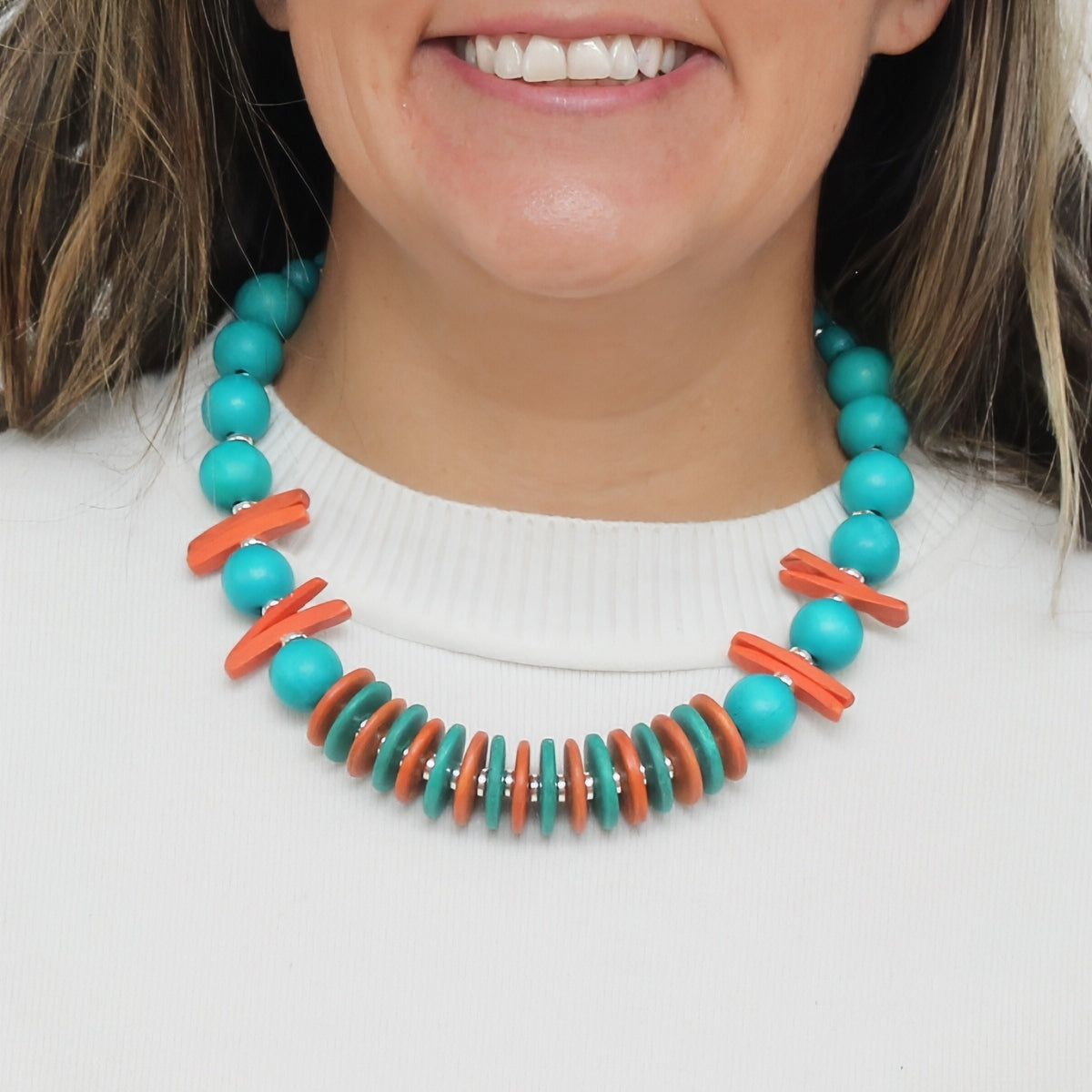 This Coral Skylar Coastal Aura Choker Necklace features a stunning mix of coral and turquoise beads, accented with silver details. Handcrafted in-house for a unique statement piece that captures the coastal aura. Elevate your look with this one-of-a-kind necklace.
