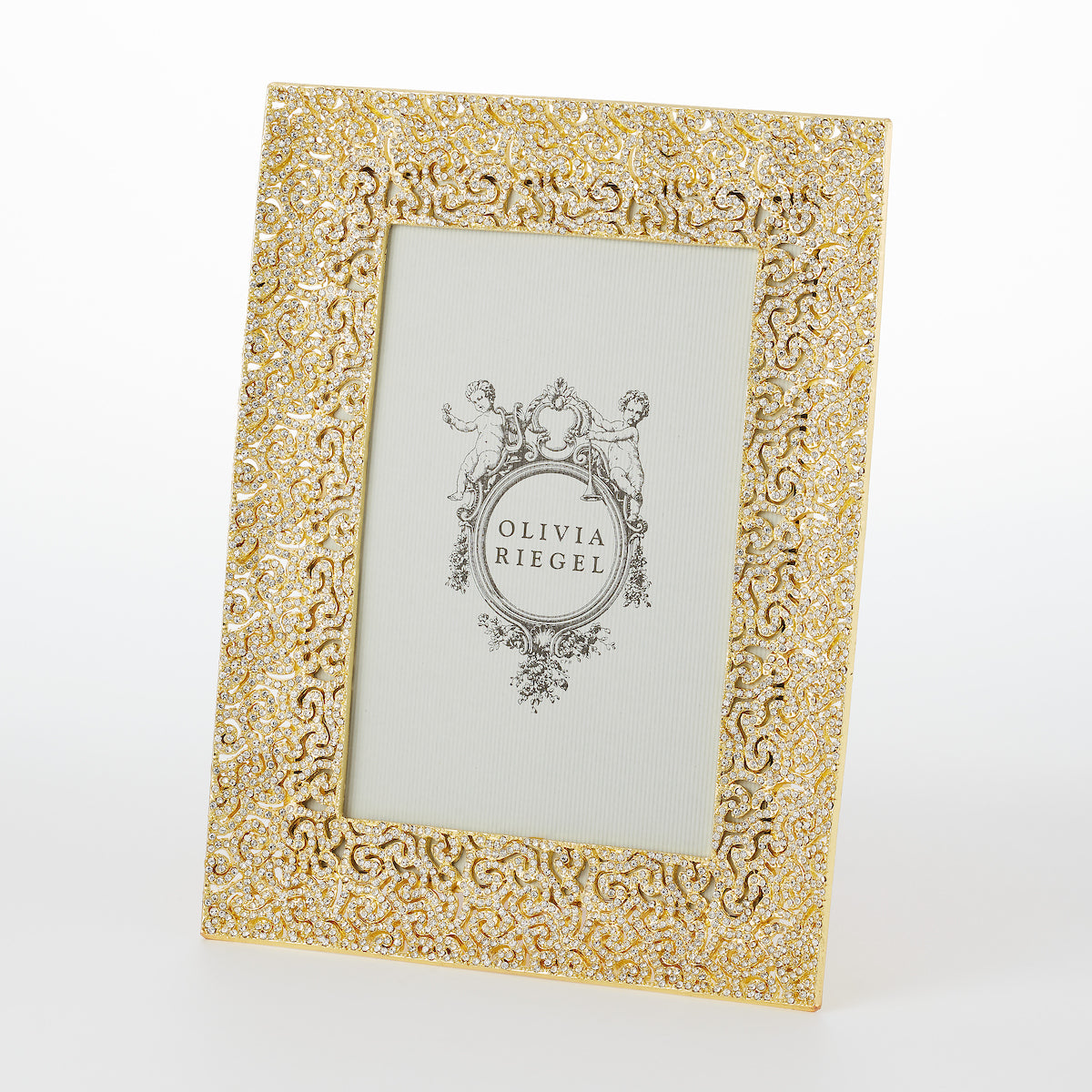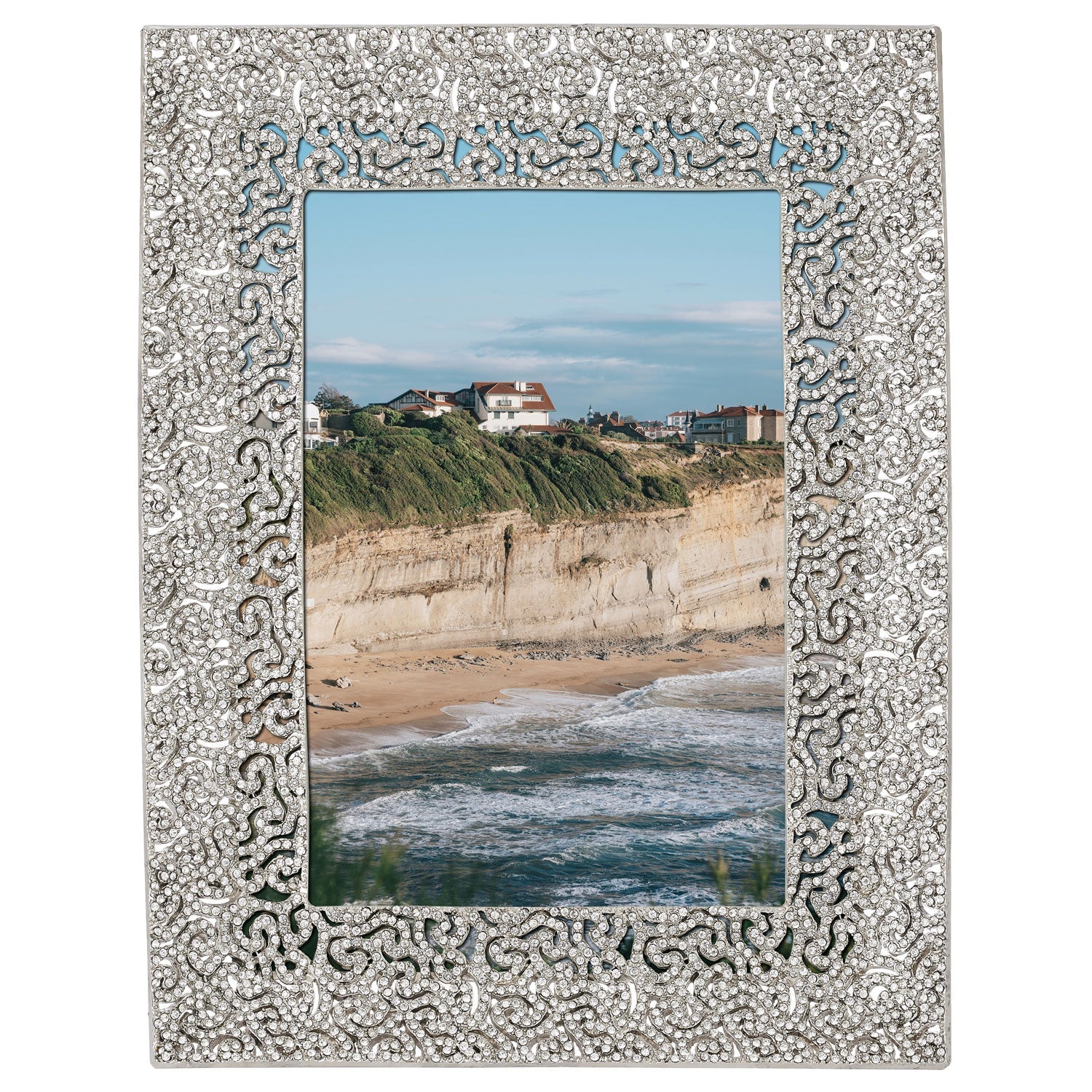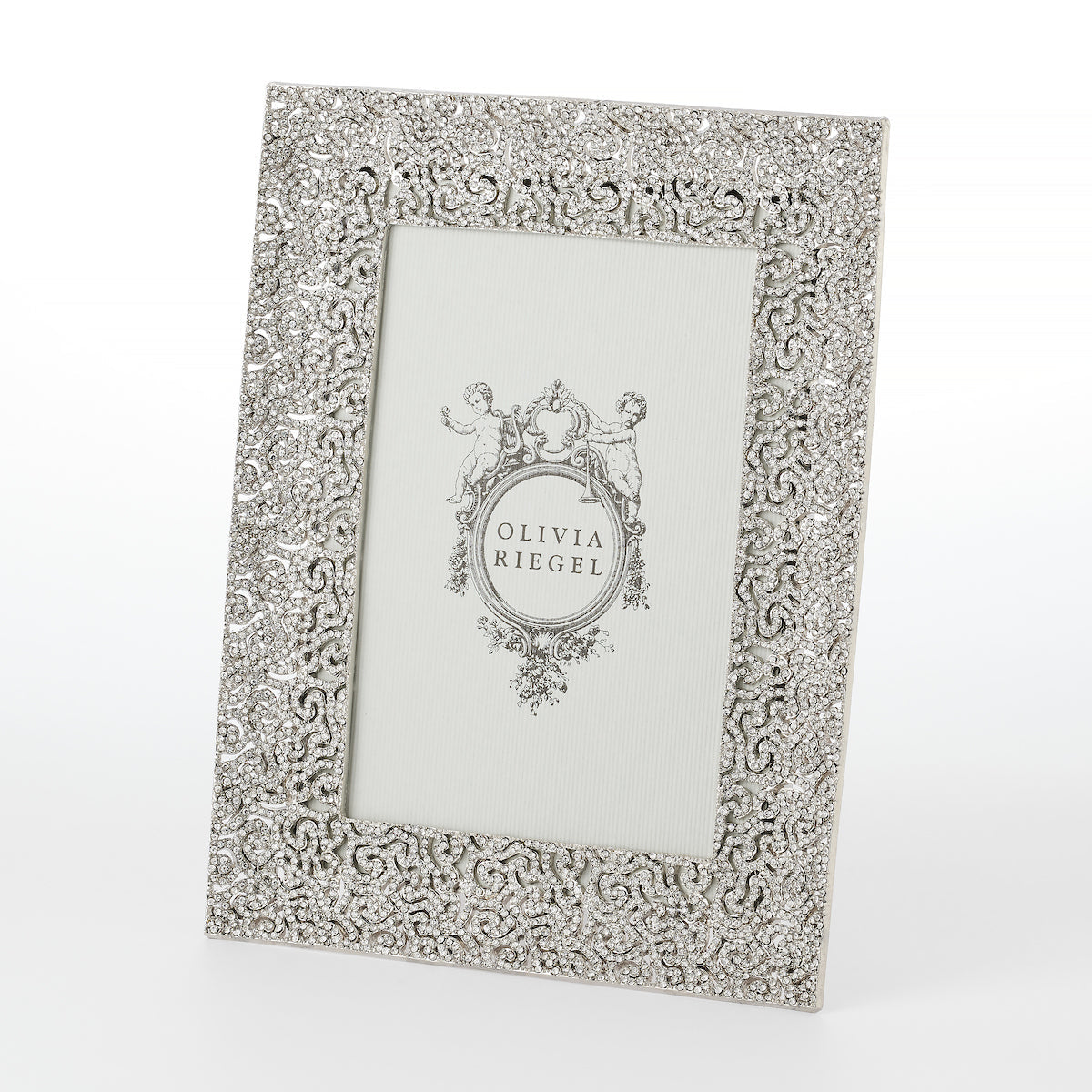 Gold or silver finished pewter coiled filigree pattern, encrusted with hundreds of hand-set clear pavé European crystals. Elegant moiré silk back, with easel designed for vertical or horizontal placement. Beveled glass. Tarnish resistant. Signature luxury gift box included.