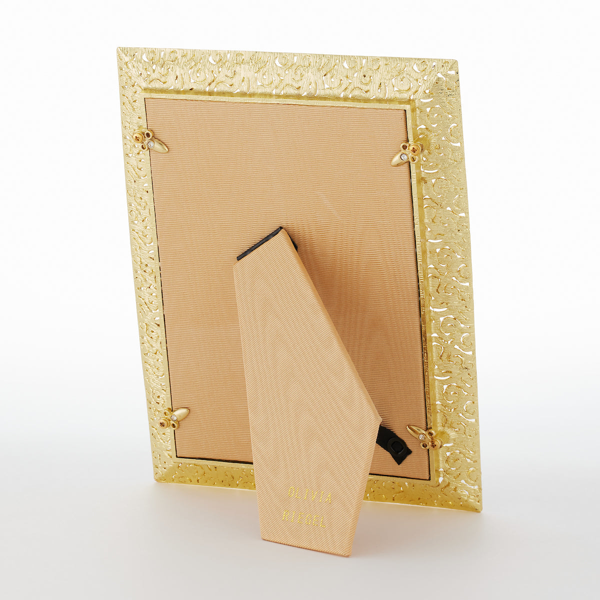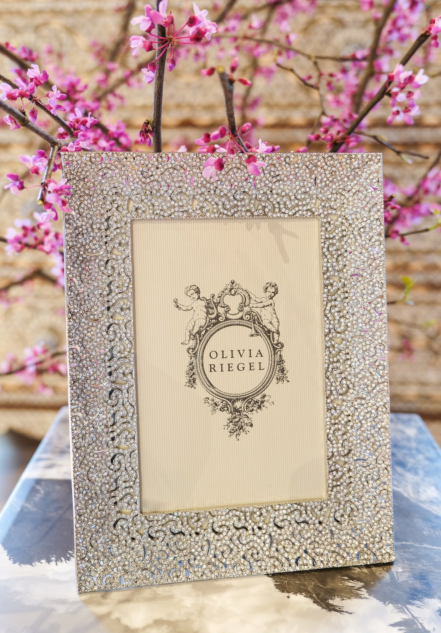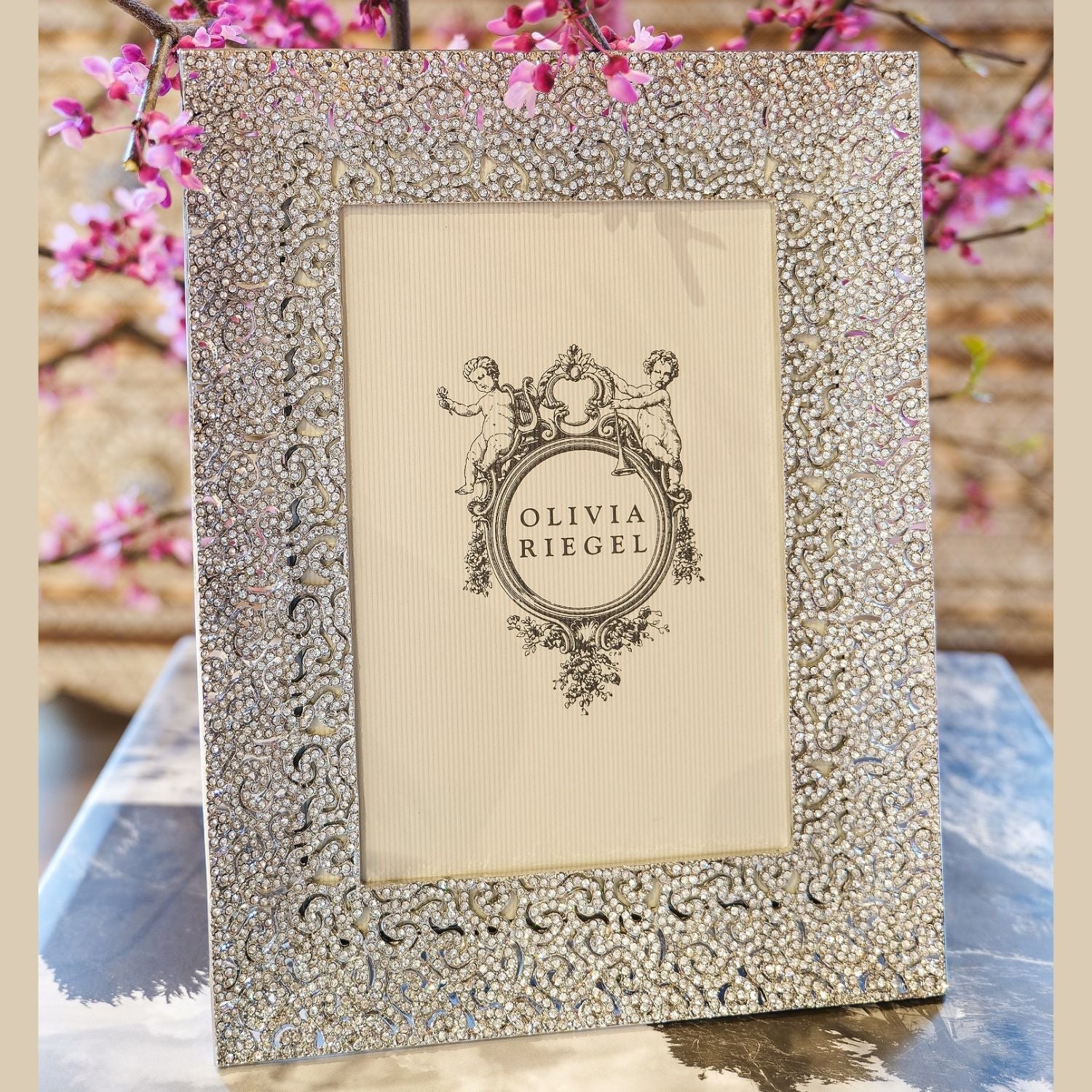 Gold or silver finished pewter coiled filigree pattern, encrusted with hundreds of hand-set clear pavé European crystals. Elegant moiré silk back, with easel designed for vertical or horizontal placement. Beveled glass. Tarnish resistant. Signature luxury gift box included.