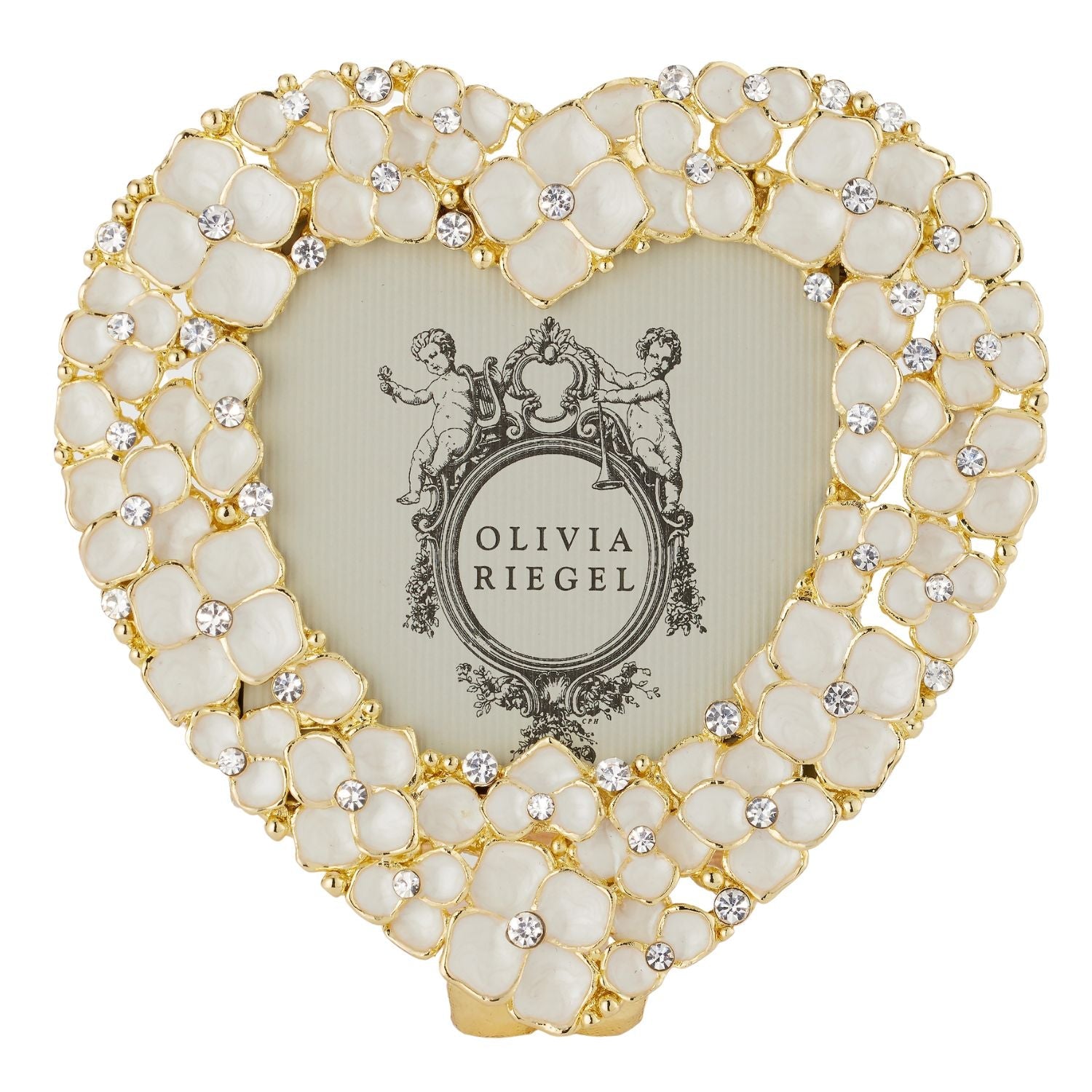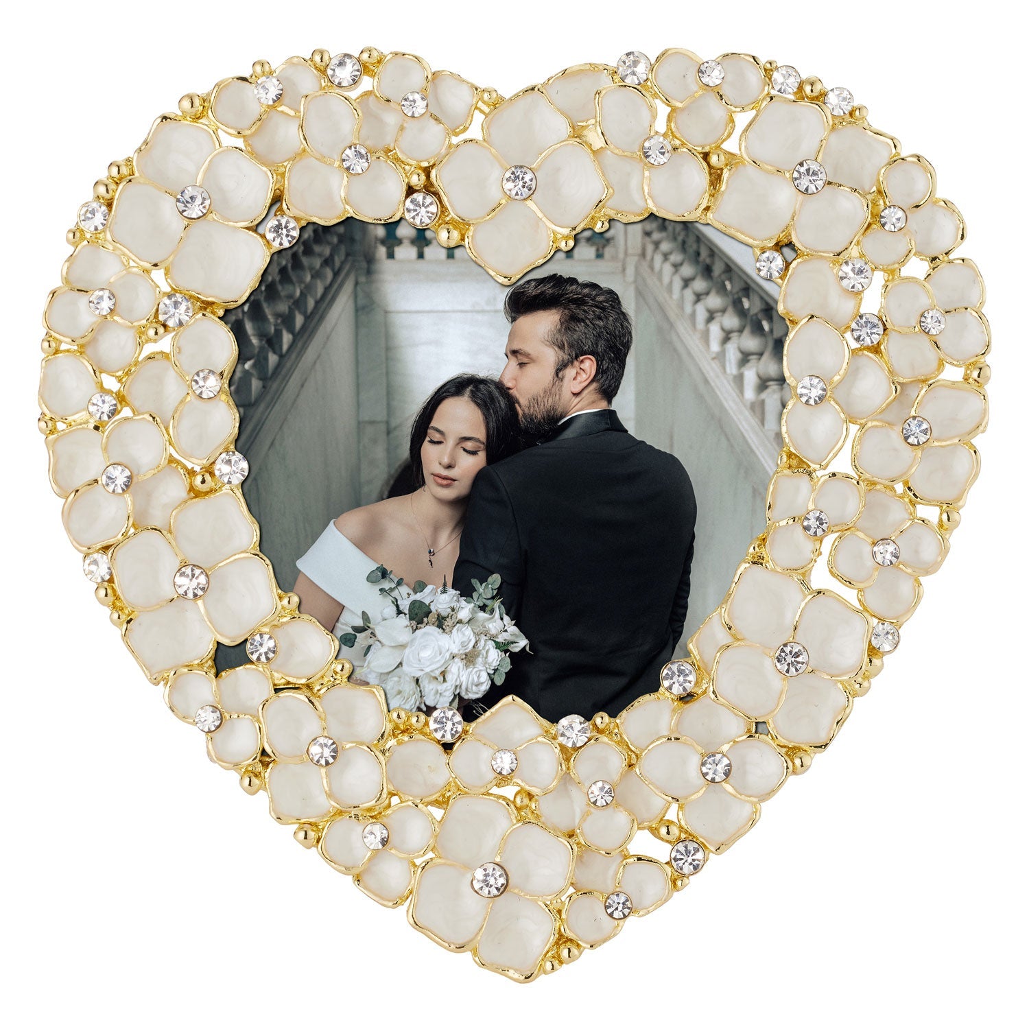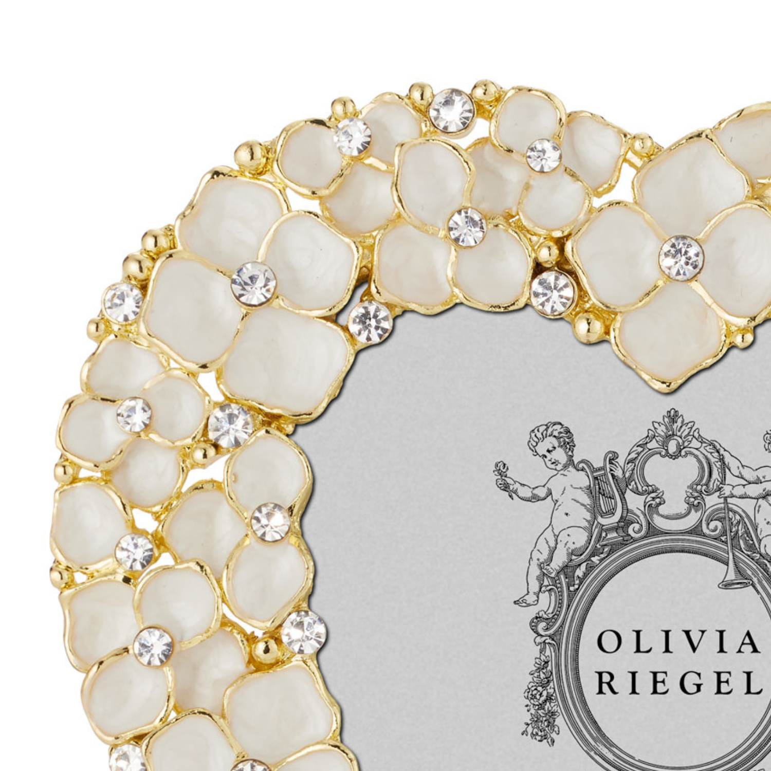 Delicate dogwood blossoms, richly cast in gold finished pewter picture frame, with ivory hued hand-enameling and hand-set clear European crystals. Elegant champagne moiré silk back. Tarnish resistant. Signature luxury gift box included.