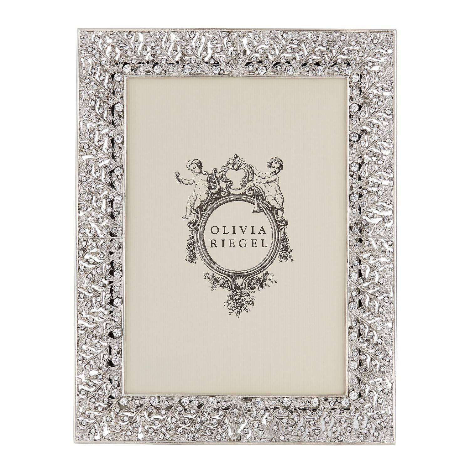 Silver finished pewter picture frame with an acanthus leaf pattern, richly encrusted with hand-set clear European crystals. Elegant gray hued moiré silk back, with easel designed for vertical or horizontal placement. Beveled glass. Tarnish resistant. Signature luxury gift box included.