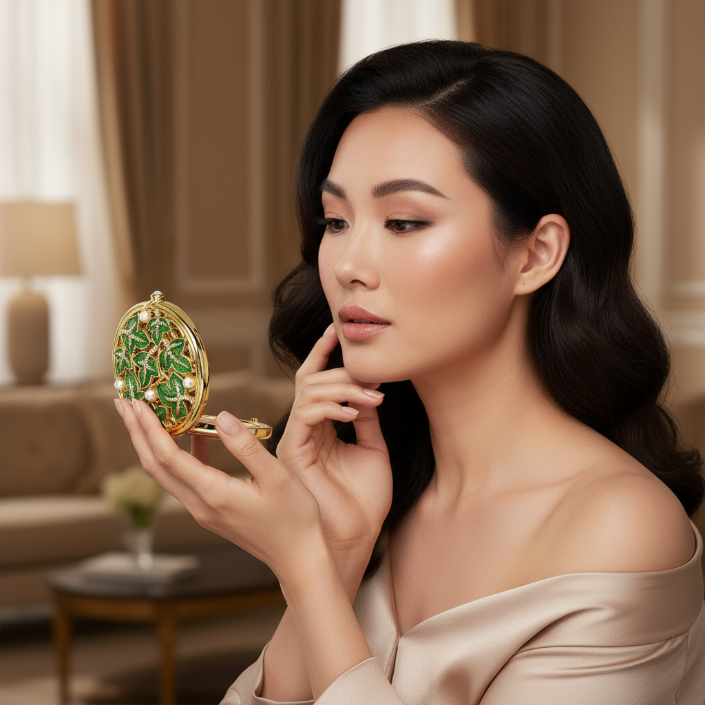 Gold finished pewter ivy vine patterned compact, with celadon green hued guilloché style hand-enameling. Encrusted with hand-set clear European crystals and faux pearls. Opens up to reveal double-sided mirror, with one side at 1x magnification and one side at 2x magnification. Cloth pouch and signature luxury gift box included.