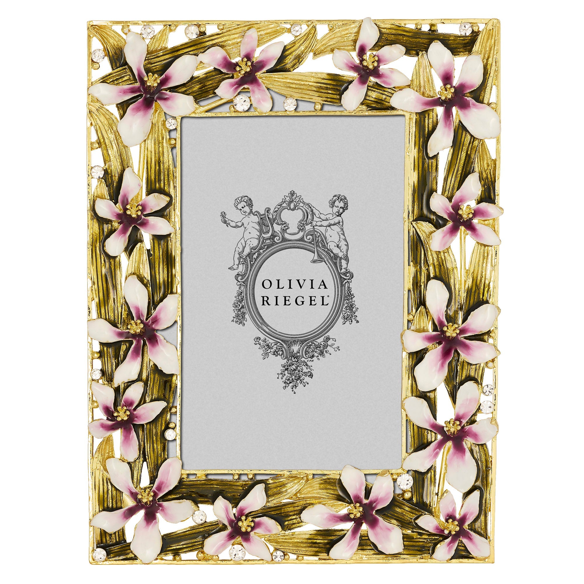 Bring the delicate beauty of the orchid into your home with these majestic picture frames. Gold finished pewter with vibrant purple and green hued hand-enameling and hand-set clear European crystals. Elegant champagne hued moiré silk back, with easel designed for vertical or horizontal placement. Signature luxury gift box included.