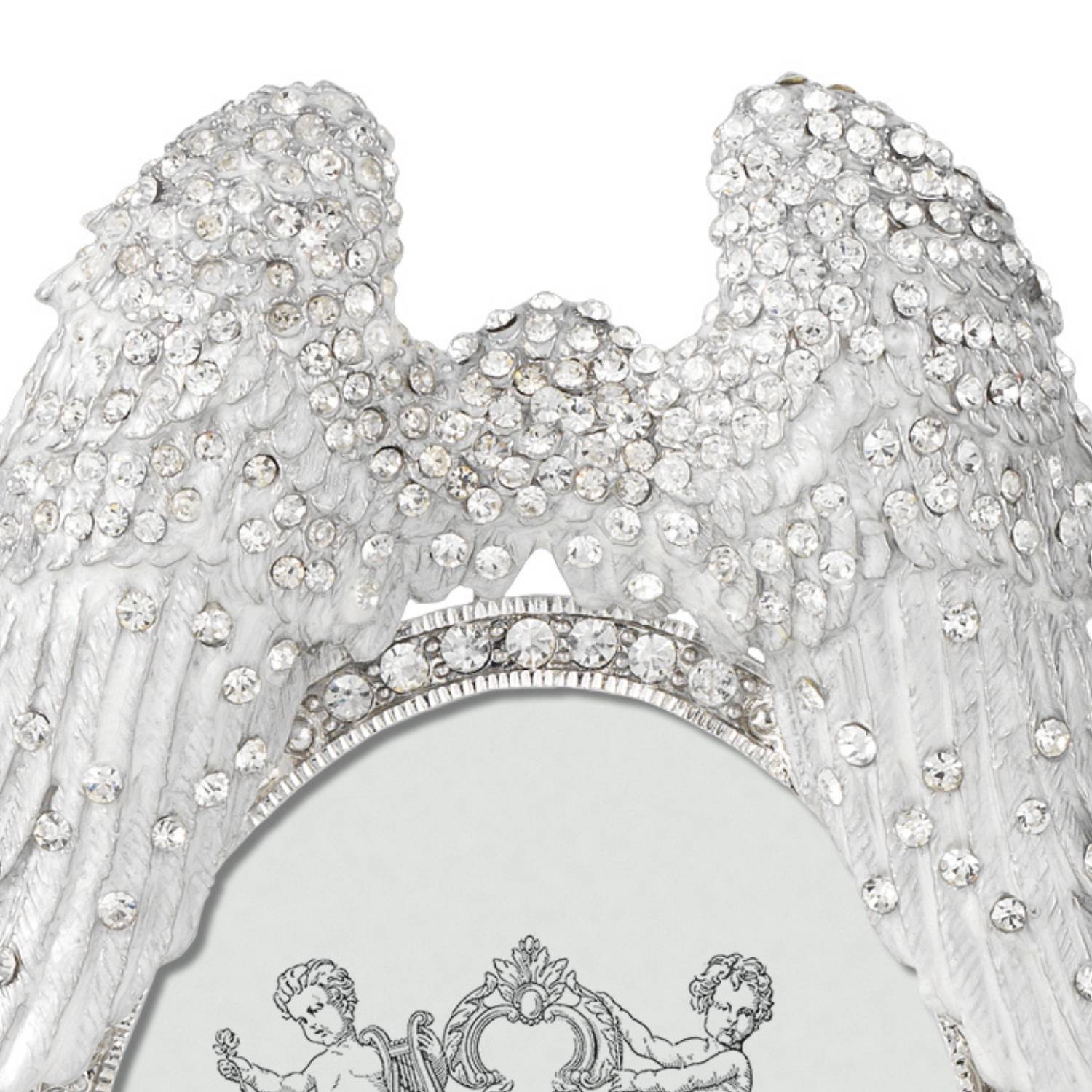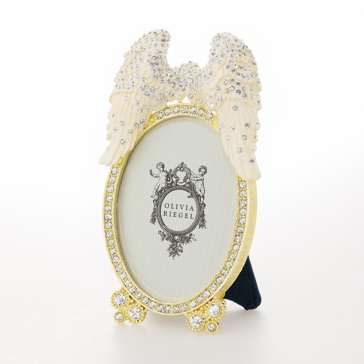 Cast pewter picture frame in either gold with ivory hand-enameling or silver with silvery-white hand-enameling and hundreds of hand-set clear European crystals. Moiré silk back. Tarnish resistant. Signature luxury gift box included.