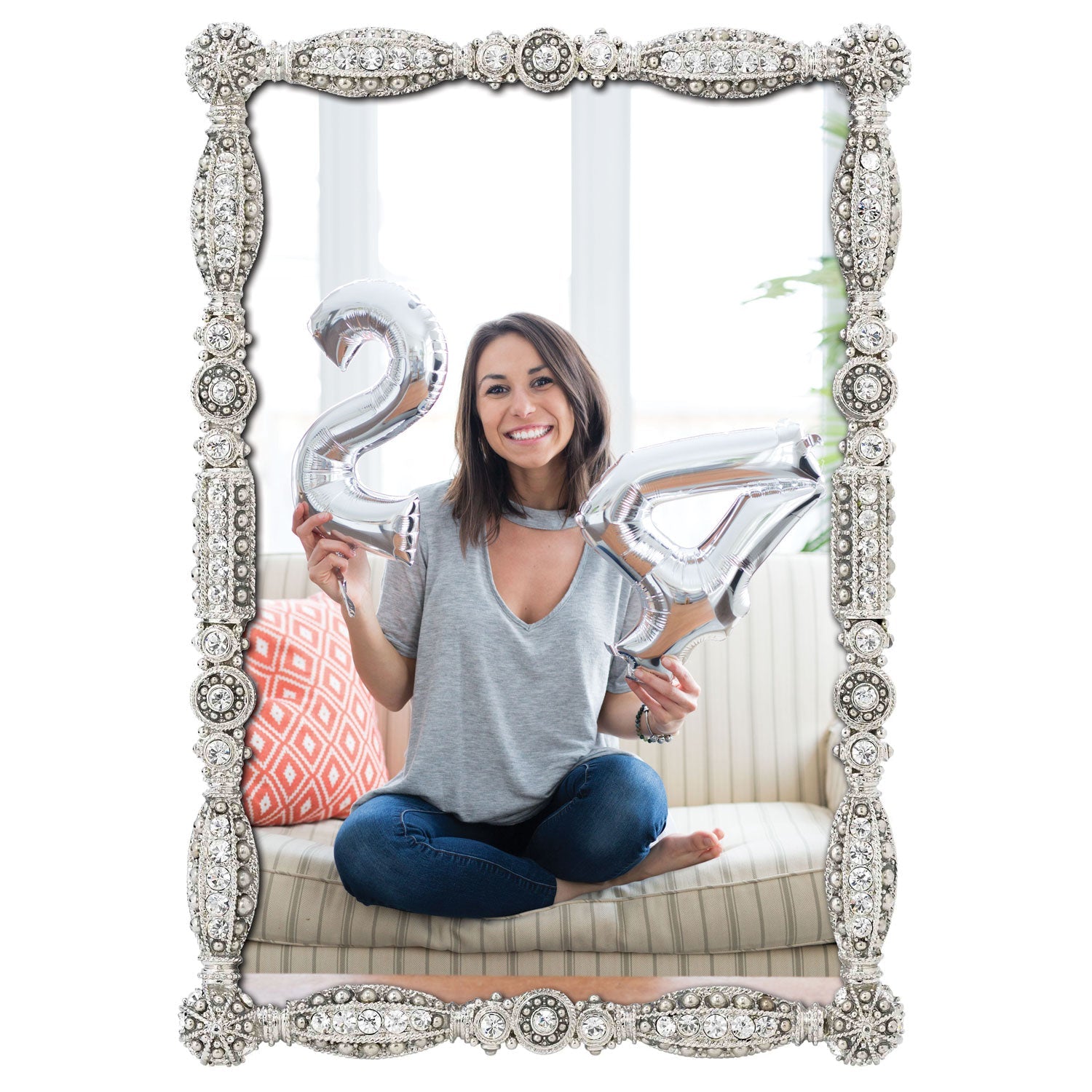 Silver or gold finished pewter picture frame with hand-set clear European crystals. Elegant moiré silk back, with easel designed for vertical or horizontal placement. Tarnish resistant. Signature luxury gift box included.