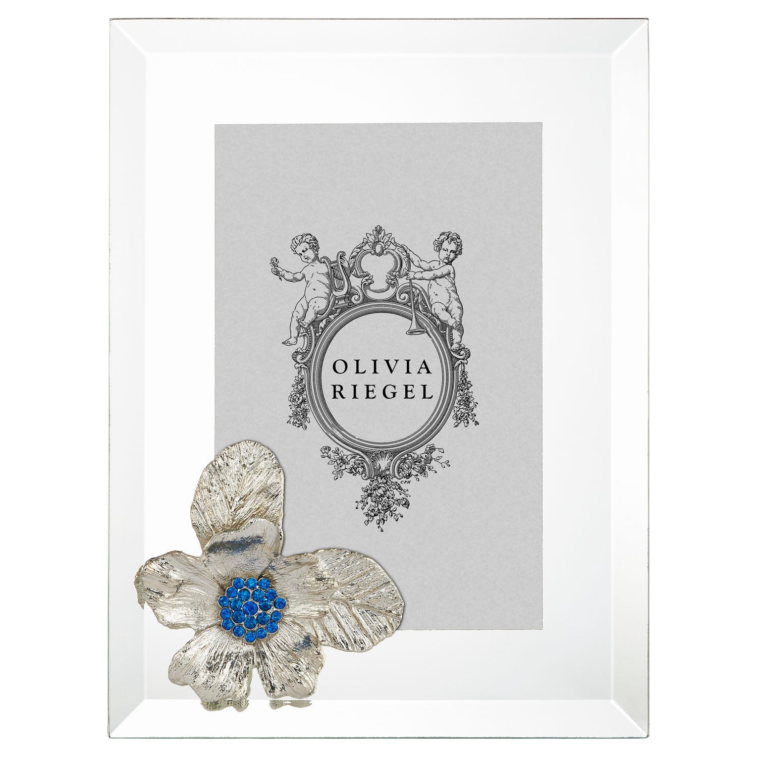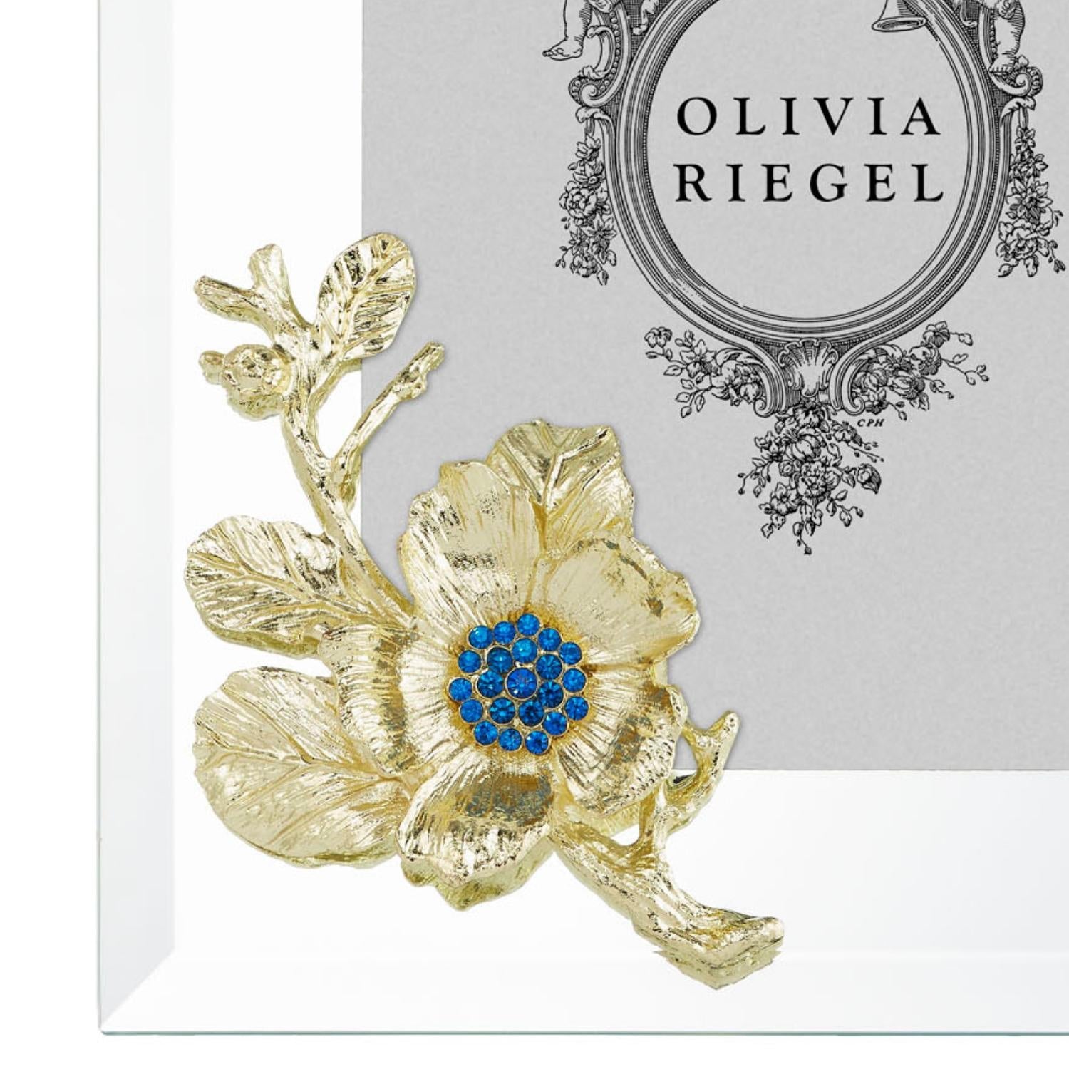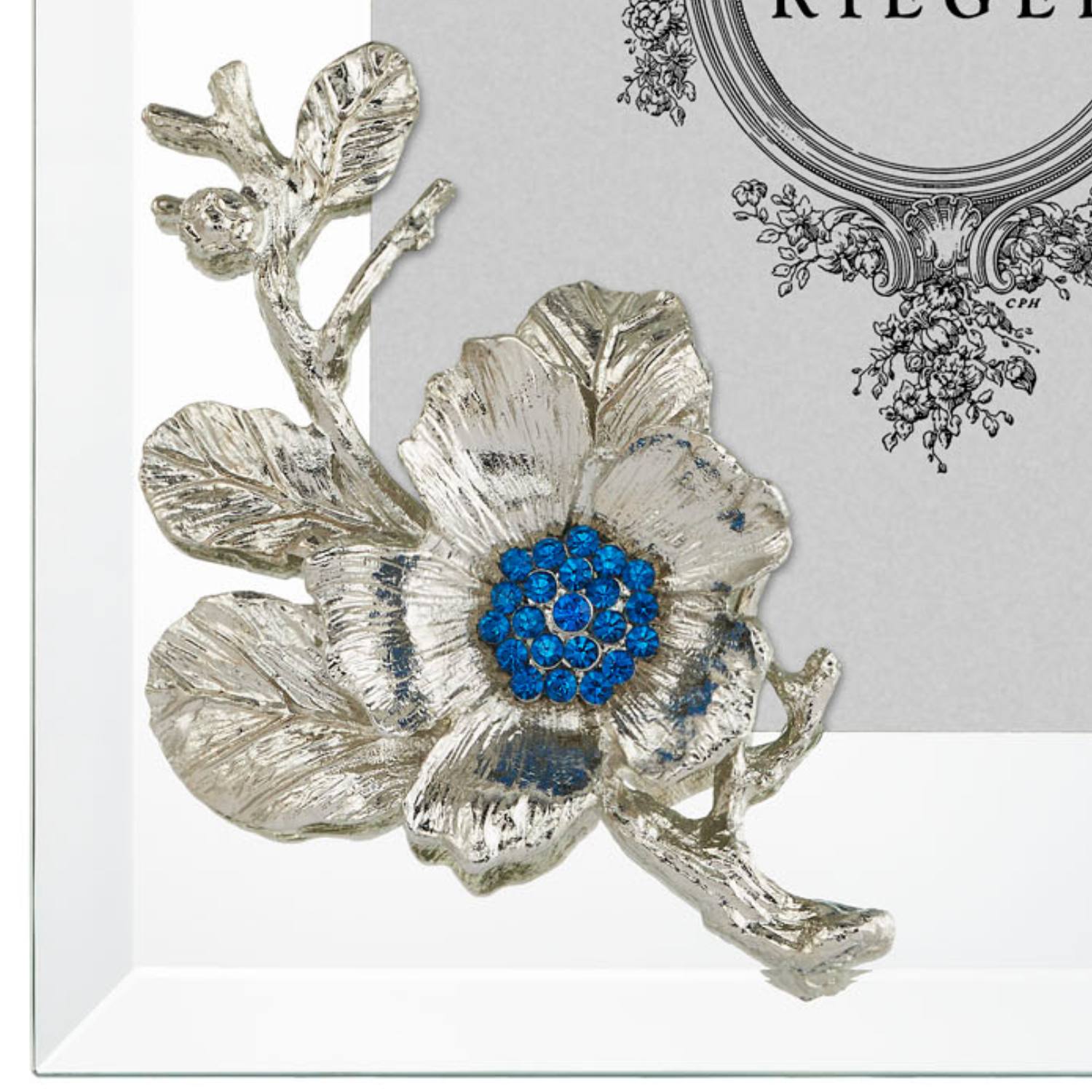 Beveled mirrored glass picture frame with gold or silver finished pewter blossom, inspired by the beautiful Rugosa Rose. Hand-set blue European crystals. Elegant navy moiré silk back, with easel designed for vertical or horizontal placement. Tarnish resistant. Signature luxury gift box included.