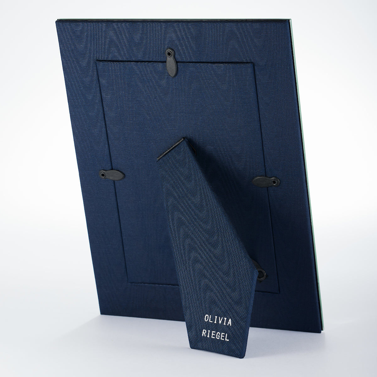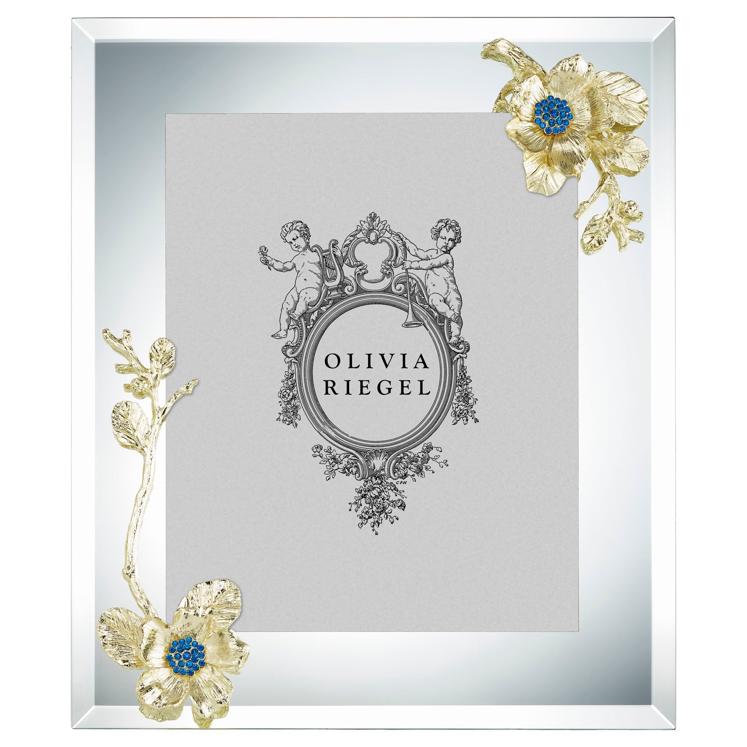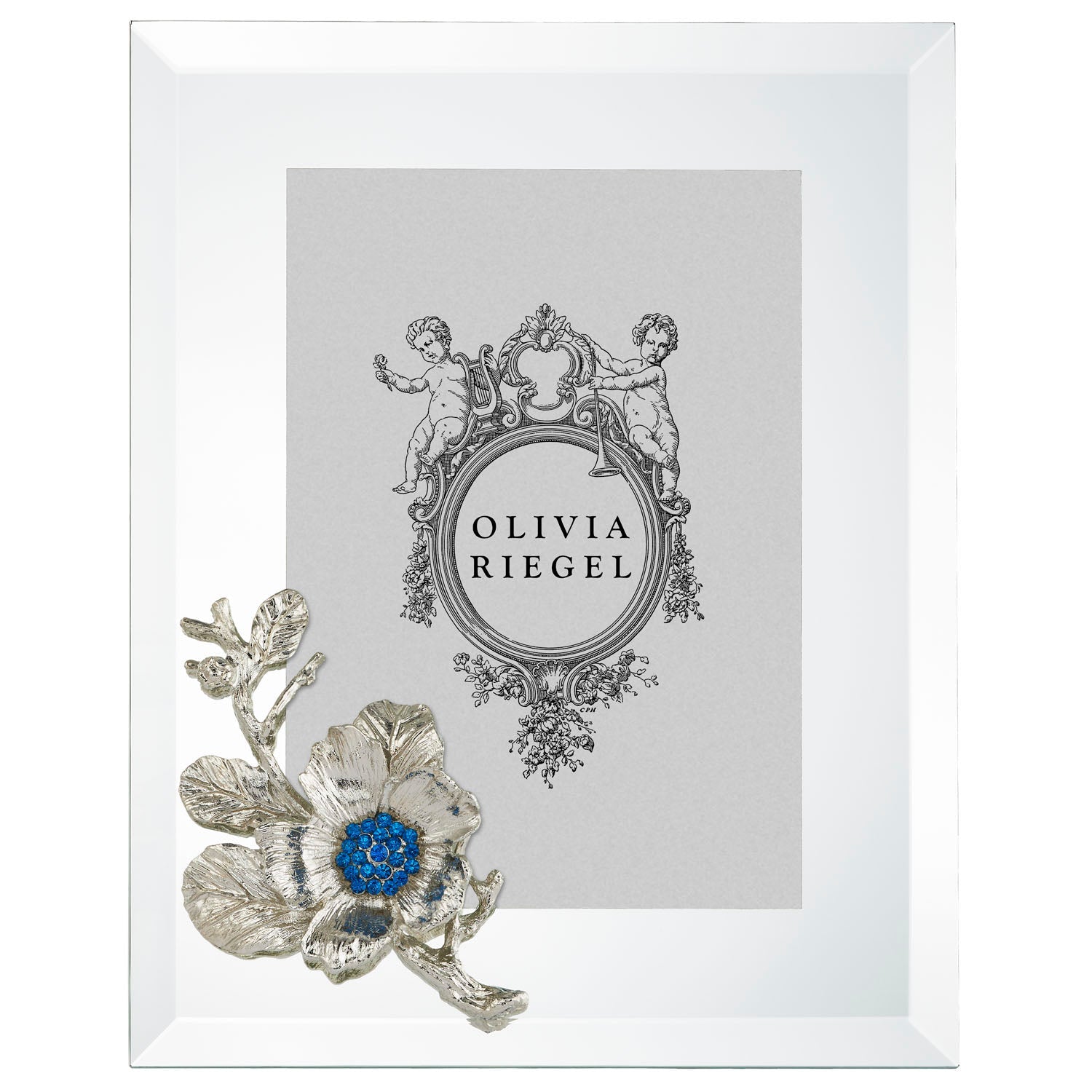 Beveled mirrored glass picture frame with gold or silver finished pewter blossom, inspired by the beautiful Rugosa Rose. Hand-set blue European crystals. Elegant navy moiré silk back, with easel designed for vertical or horizontal placement. Tarnish resistant. Signature luxury gift box included.