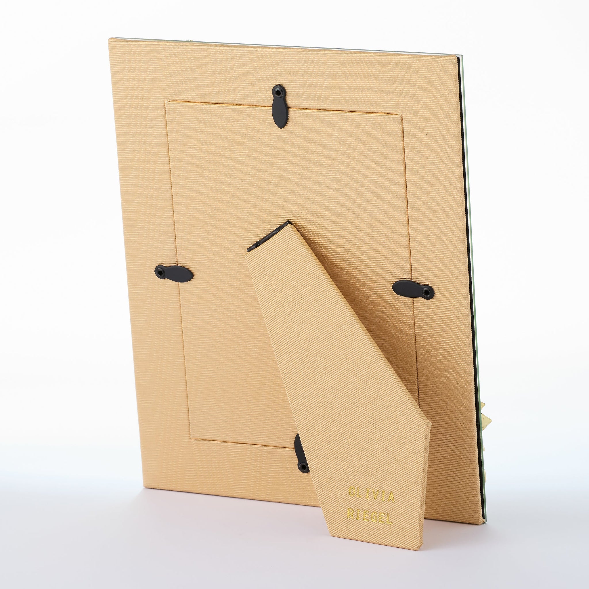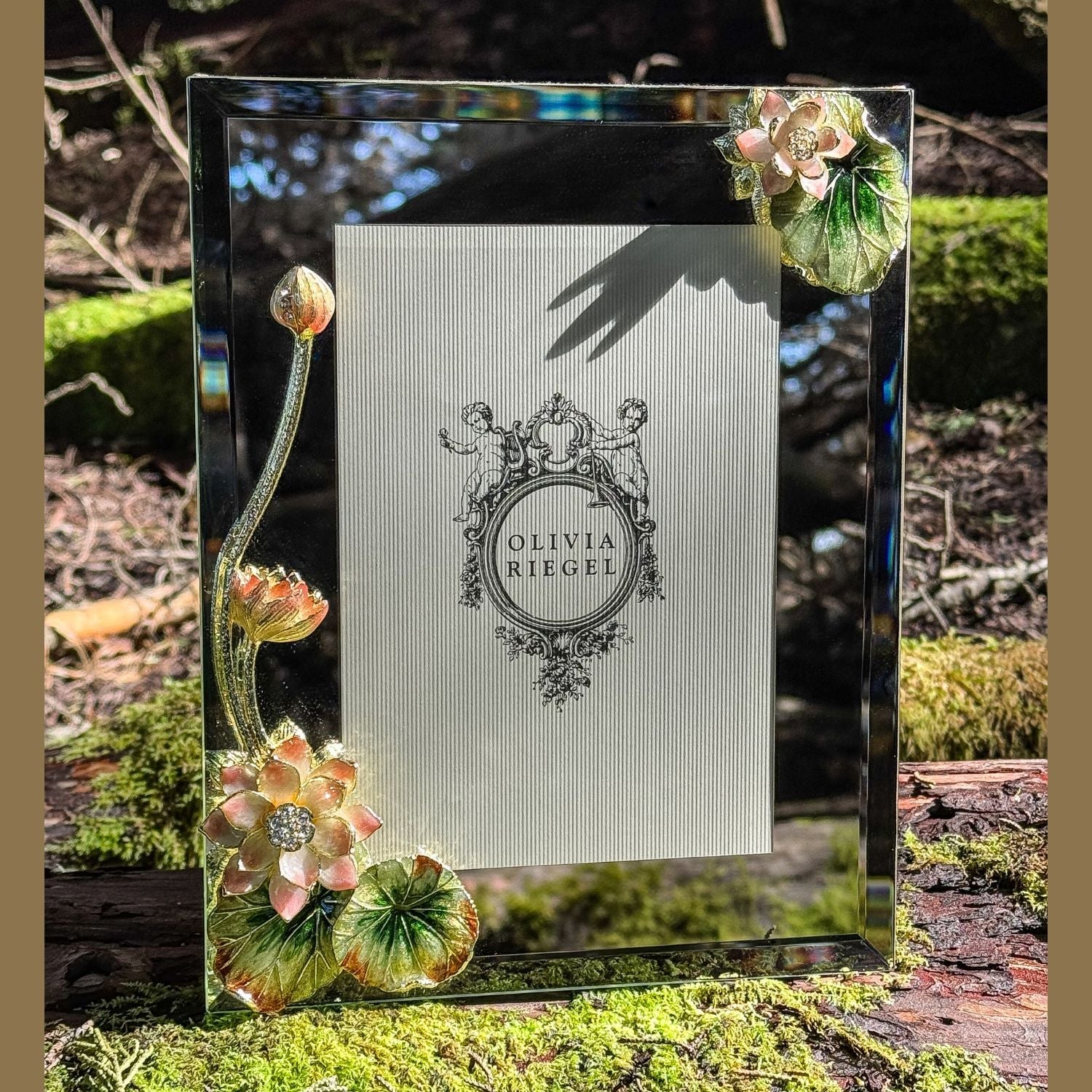 Honoring the beauty and purity of the lotus blossom. Beveled mirrored glass picture frame, adorned with gold finished pewter lotus blossoms and leaves, intricately hand-enameled in soft pink and green hues. Hand-set clear European crystals. Elegant champagne moiré silk back, with easel designed for vertical or horizontal placement. Tarnish resistant. Signature luxury gift box included.