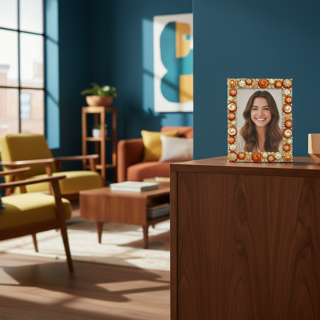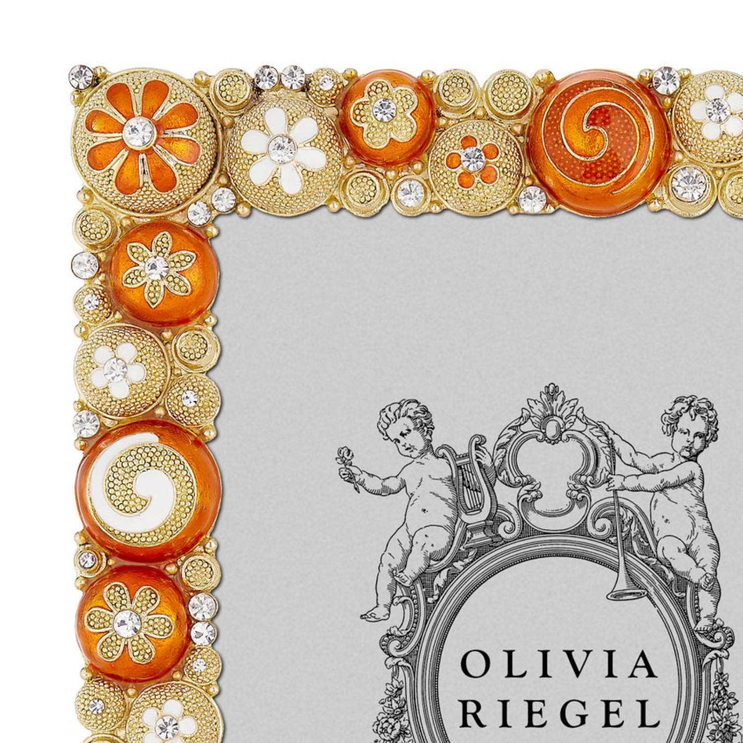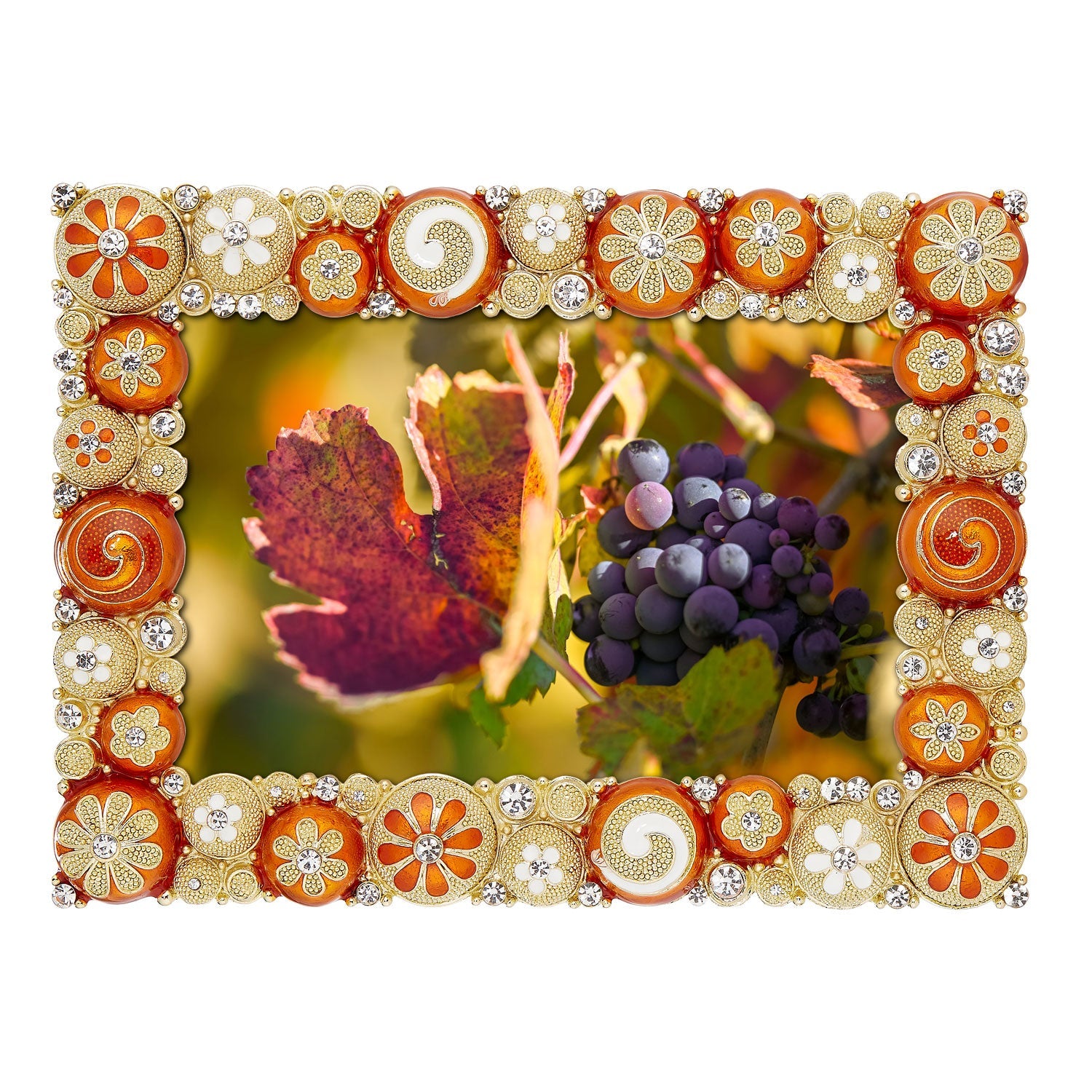 Gold finished pewter picture frame, with intricate orange and white hued hand-enameling. Encrusted with hand-set clear European crystals. Elegant champagne moiré silk back, with easel designed for vertical or horizontal placement. Beveled glass. Tarnish resistant. Signature luxury gift box included.