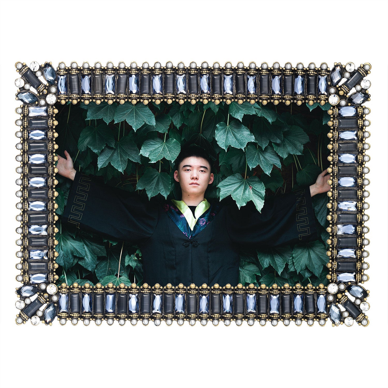 Hand-set clear European crystals, sapphire glass gems, blue cat's eye, and faux pearls in a bronze metal finish picture frame. Elegant moiré silk back with easel for vertical or horizontal placement. Tarnish resistant. Signature luxury gift box included.