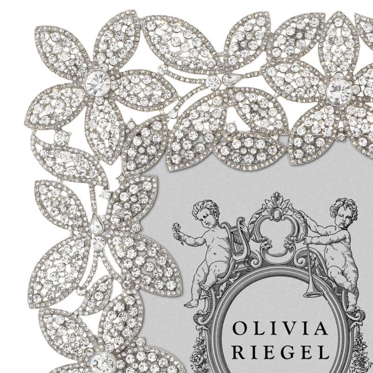 A magnificent statement piece in any setting. Silver finished pewter picture frame featuring flowers and butterflies, encrusted with hundreds of hand-set clear European crystals. Elegant gray moiré silk back with easel designed for vertical or horizontal placement. Tarnish resistant. Signature luxury gift box included.