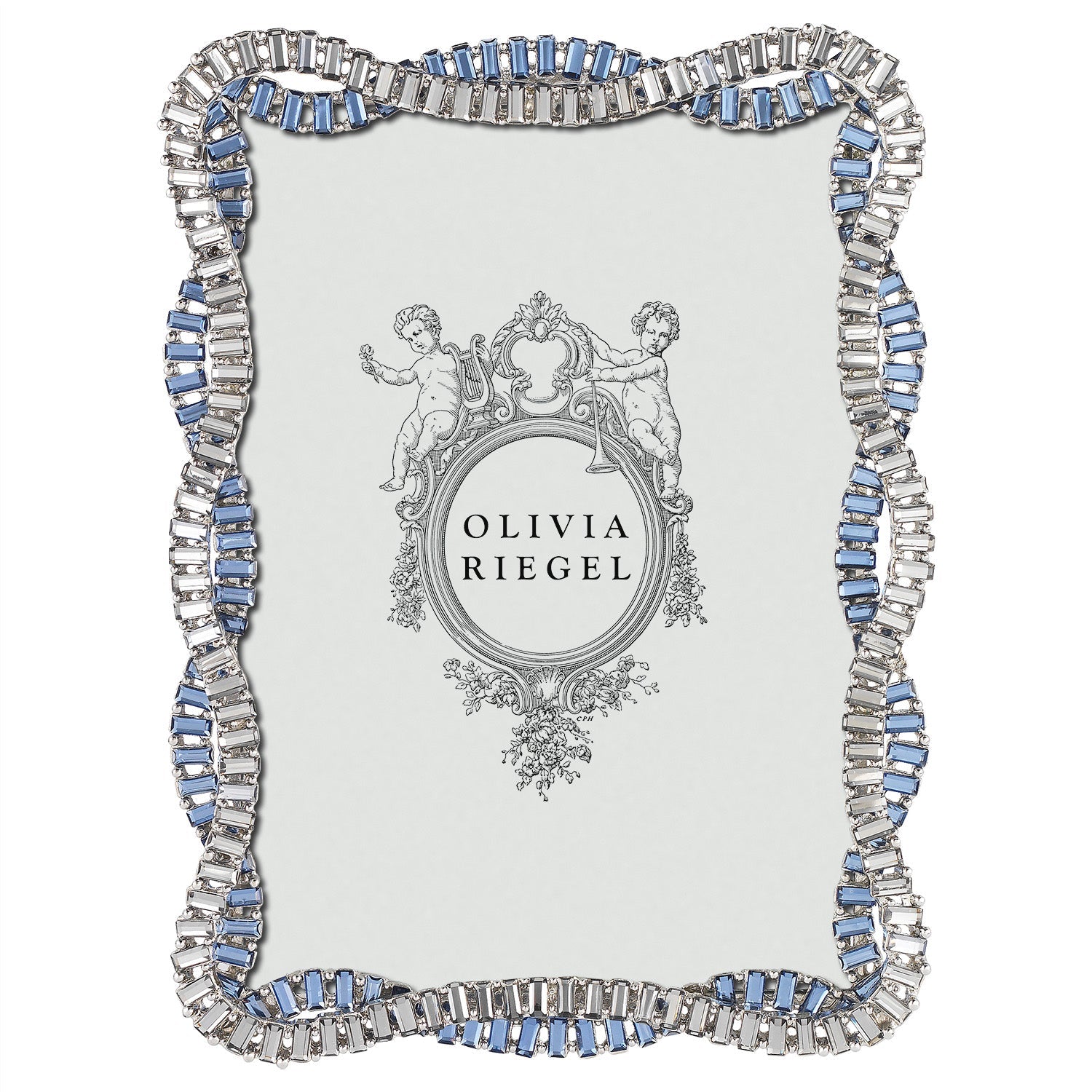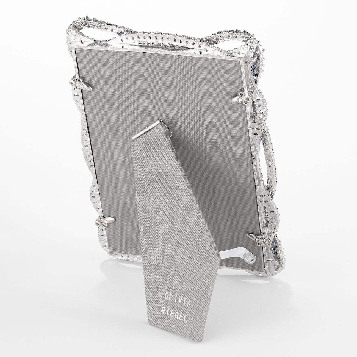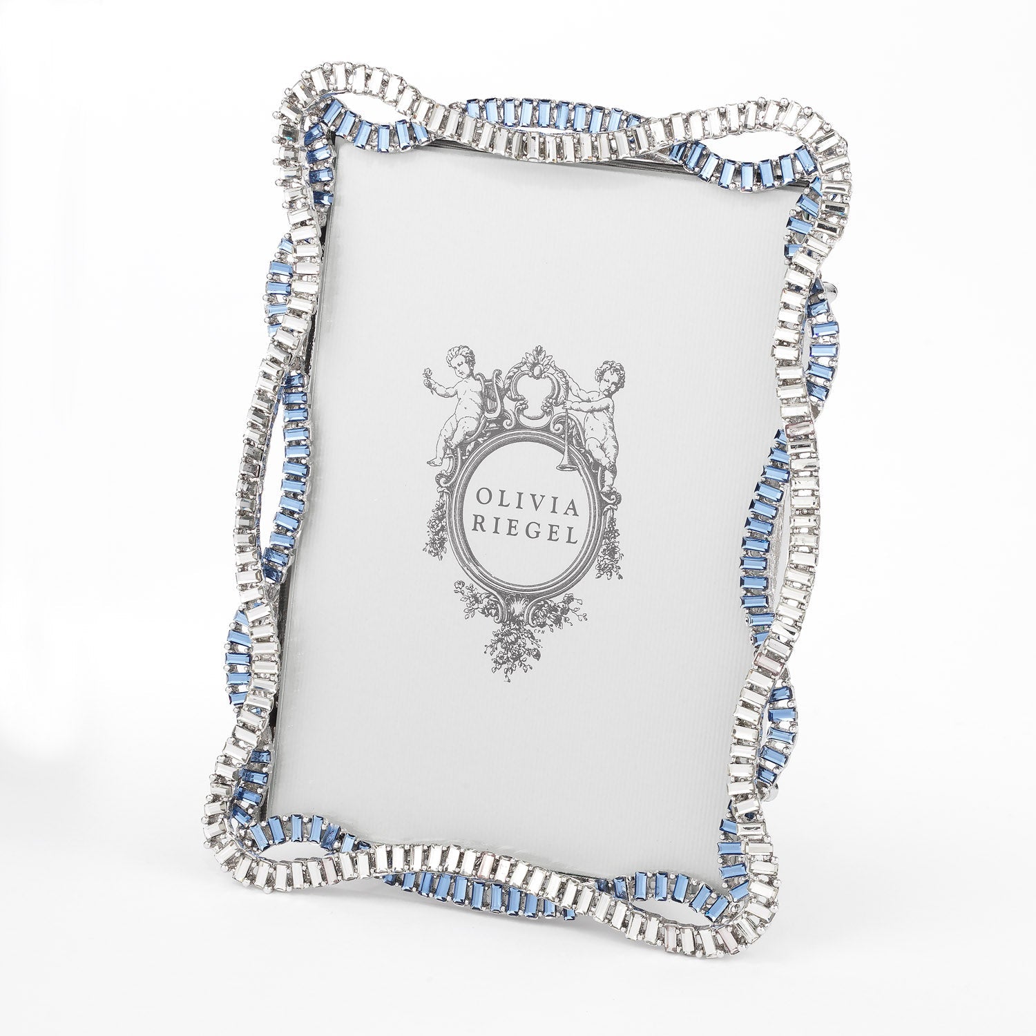 Graceful silver finished pewter picture frame in a twist pattern, encrusted with hand-set clear and light sapphire European baguette crystals. Elegant gray moiré silk back with easel designed for vertical or horizontal placement. Tarnish resistant. Signature luxury gift box included.