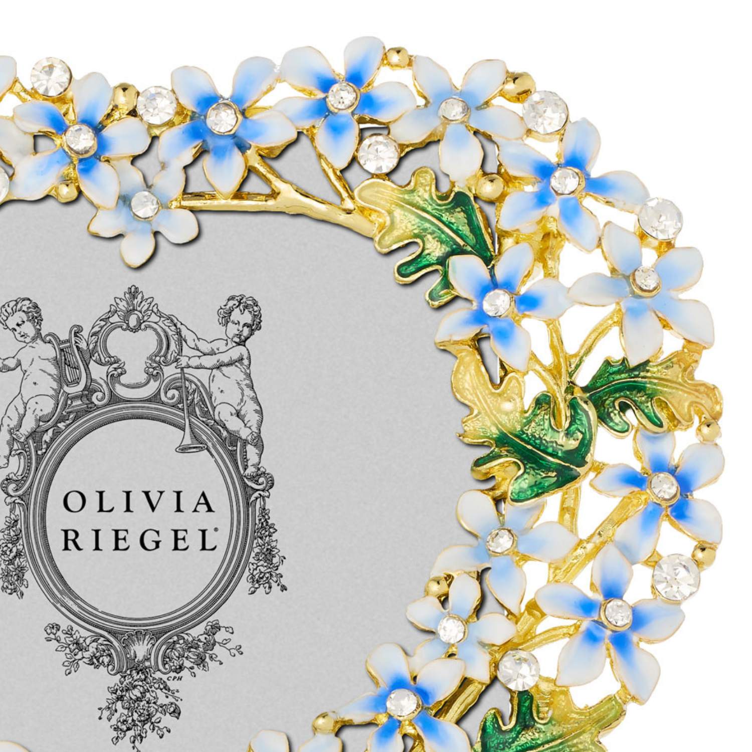 Enchanting gold finished pewter floral pattern picture frame, hand-enameled in serene blue and green hues. Hand-set clear European crystals. Elegant champagne moiré silk back. Tarnish resistant. Signature luxury gift box included.