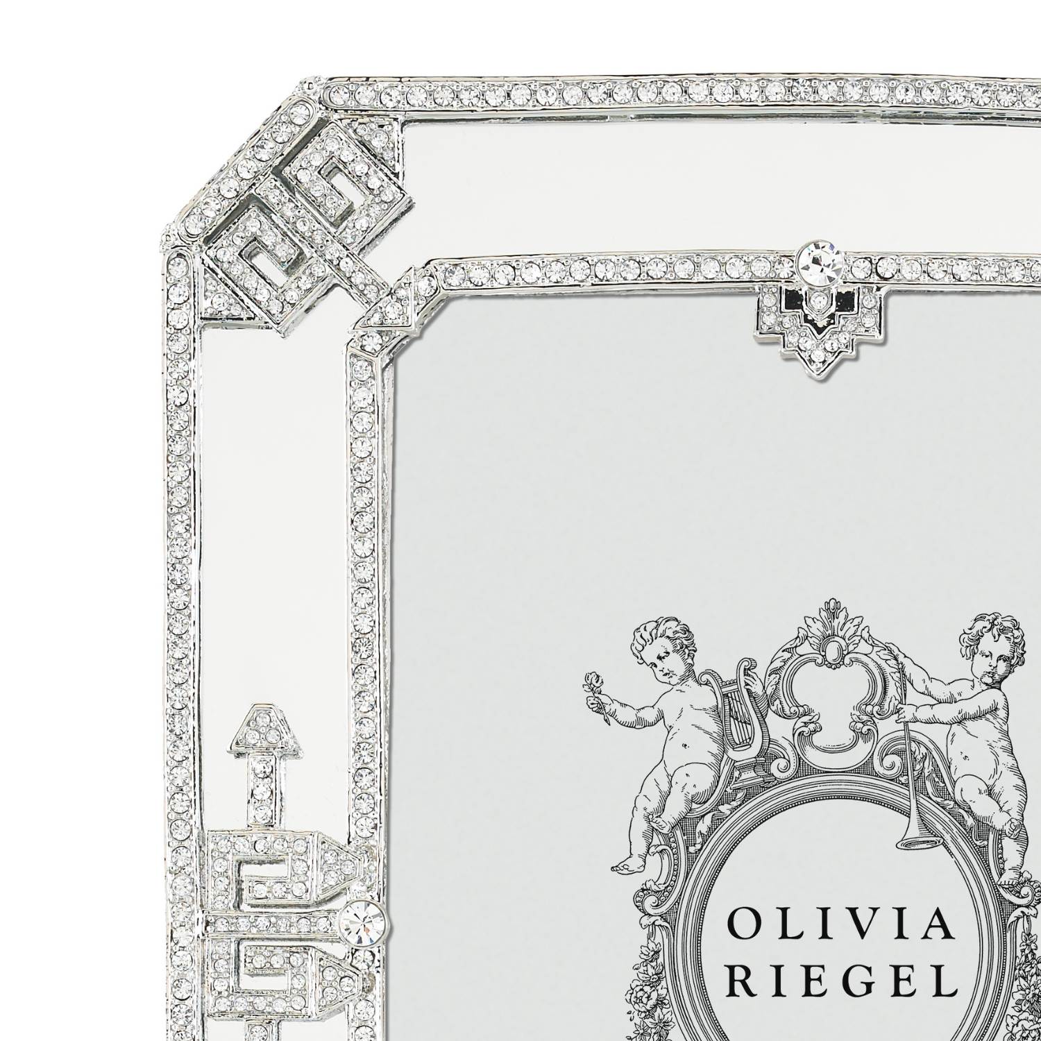 Deco styling in a silver finished pewter picture frame, inlaid with mirrored glass and encrusted with clear hand-set European crystals. Elegant gray moiré silk back with easel for vertical or horizontal placement. Tarnish resistant. Signature luxury gift box included.