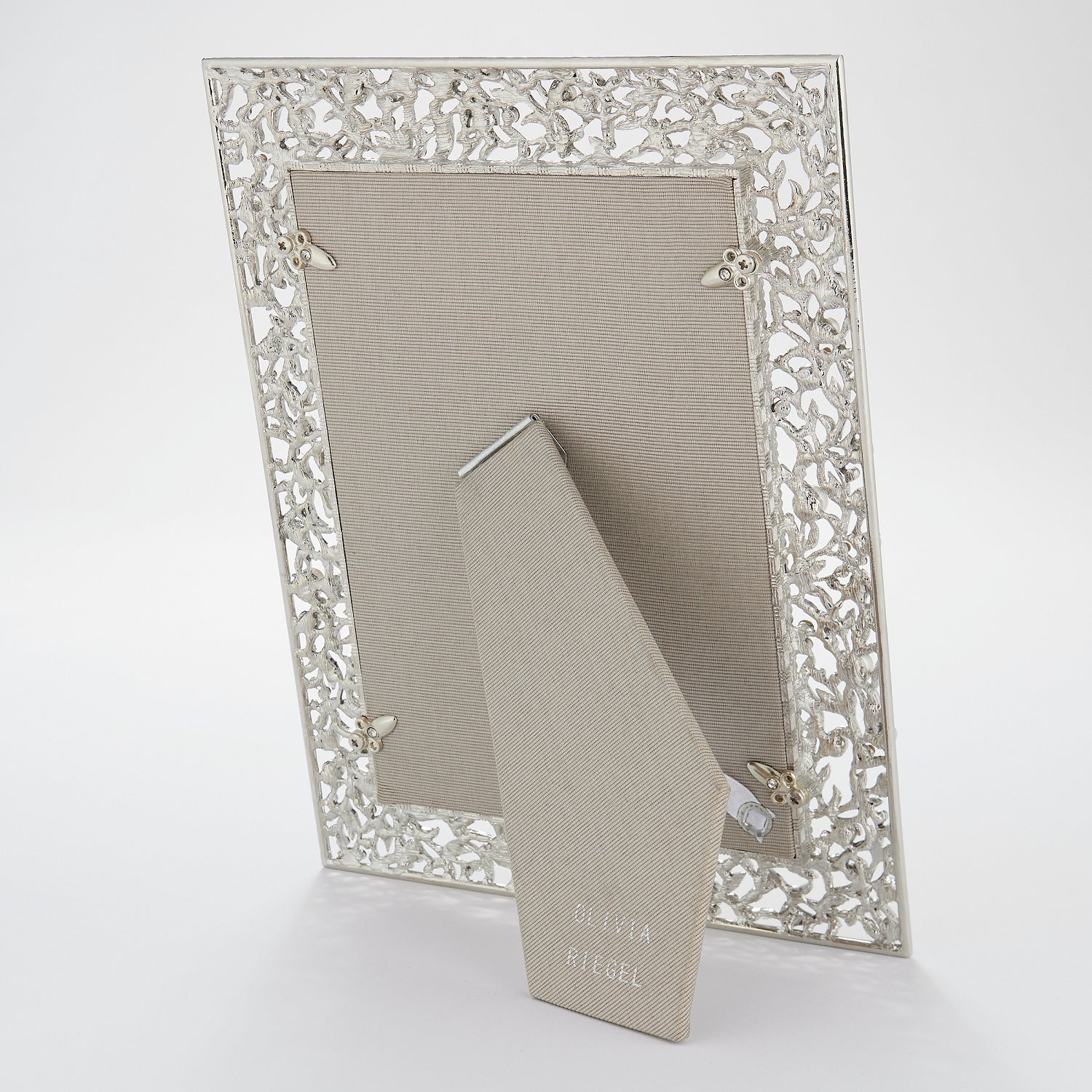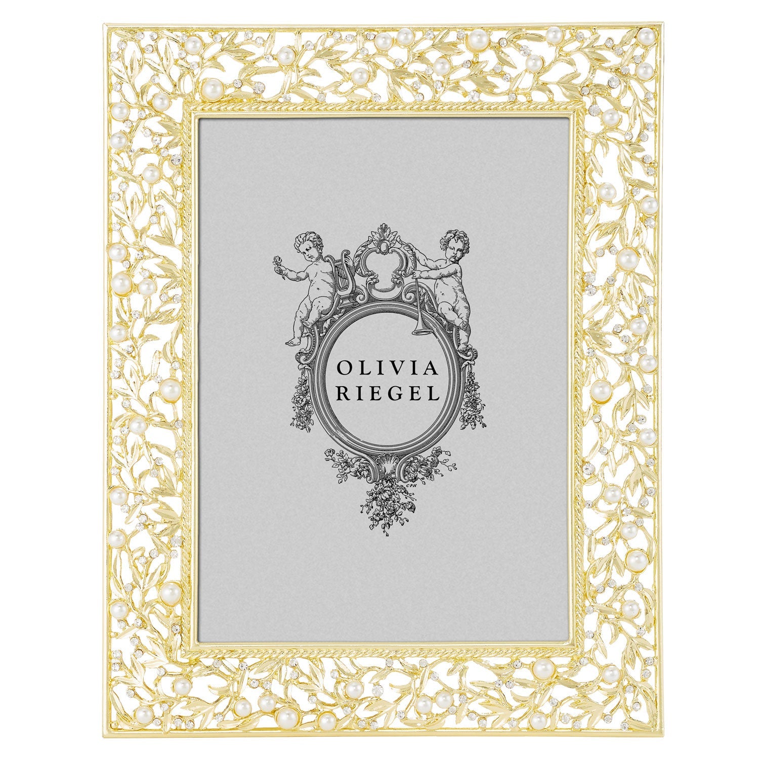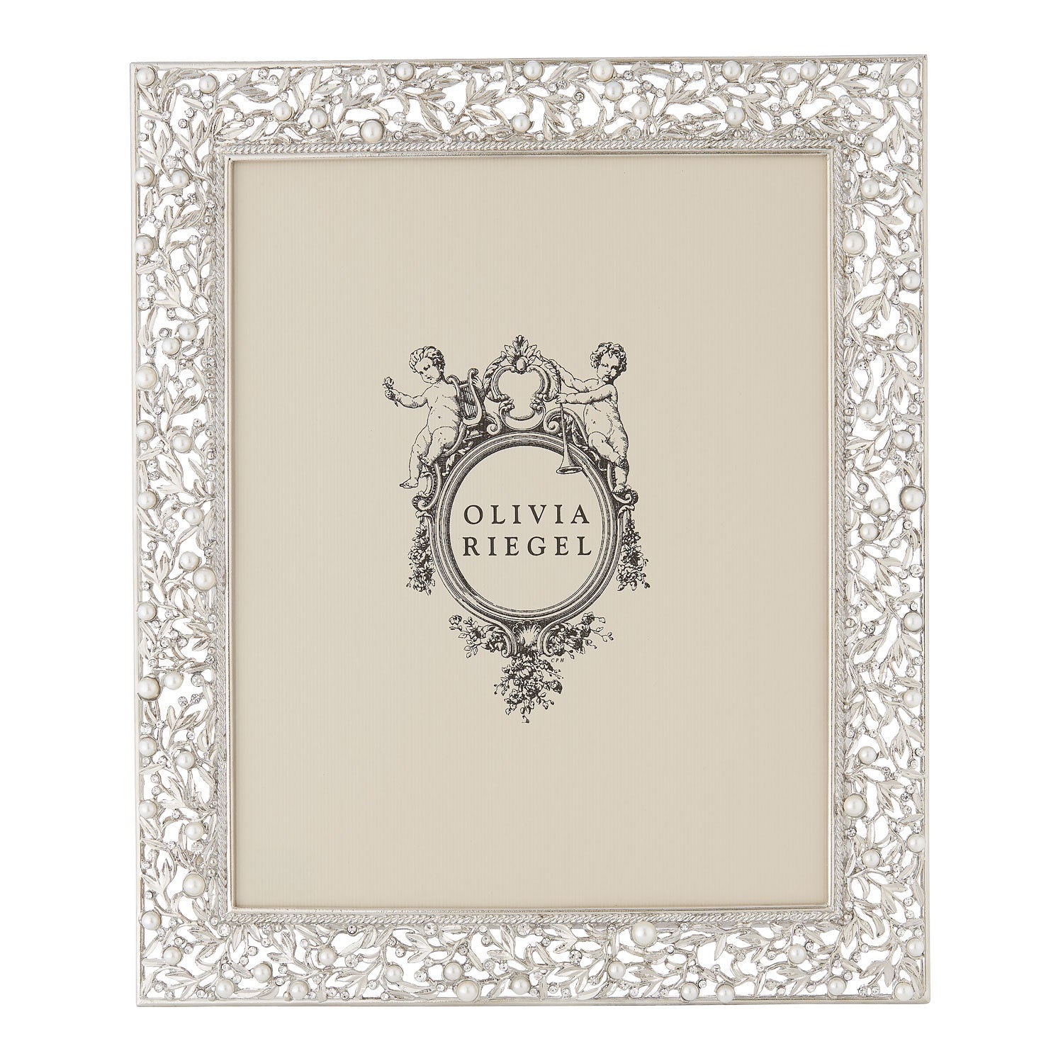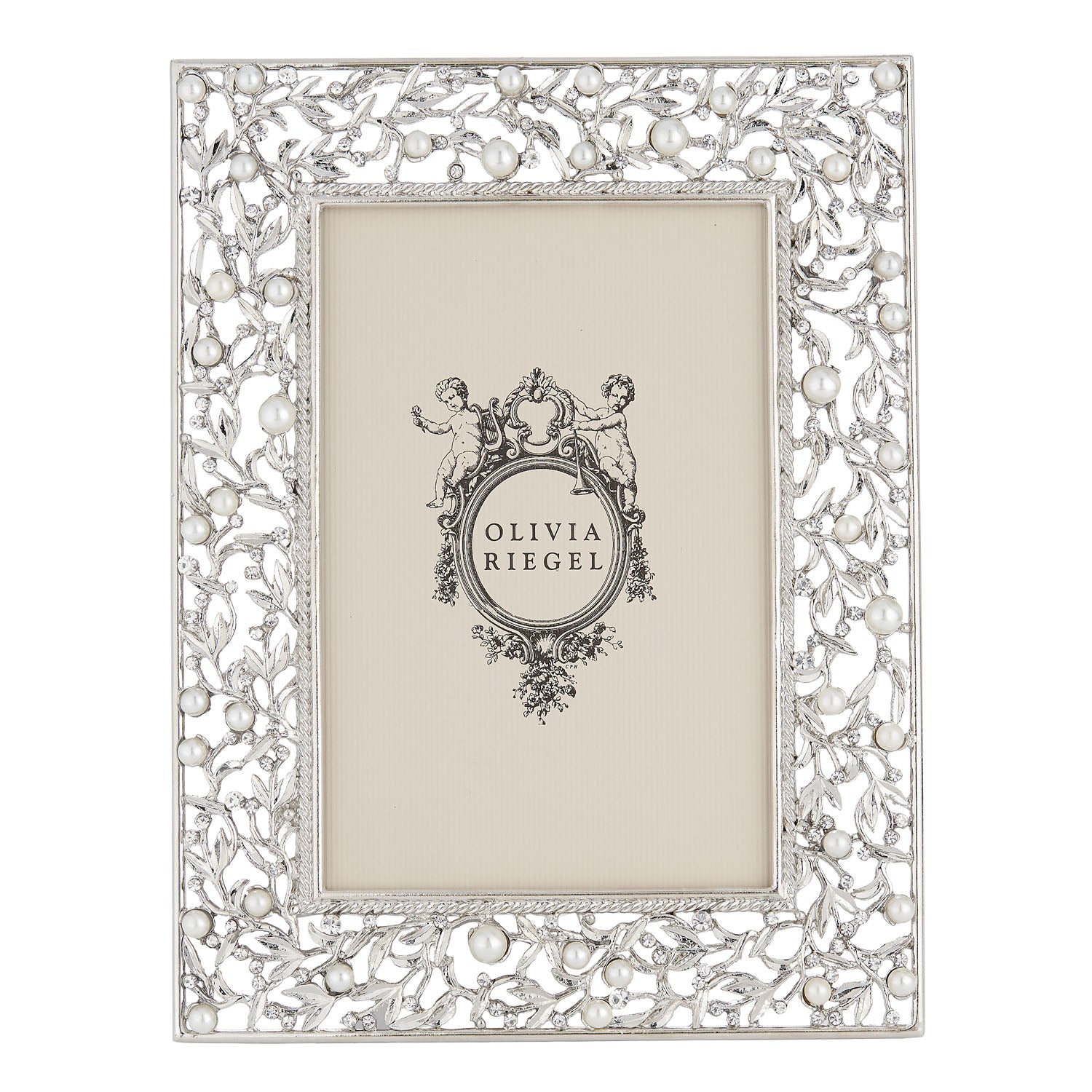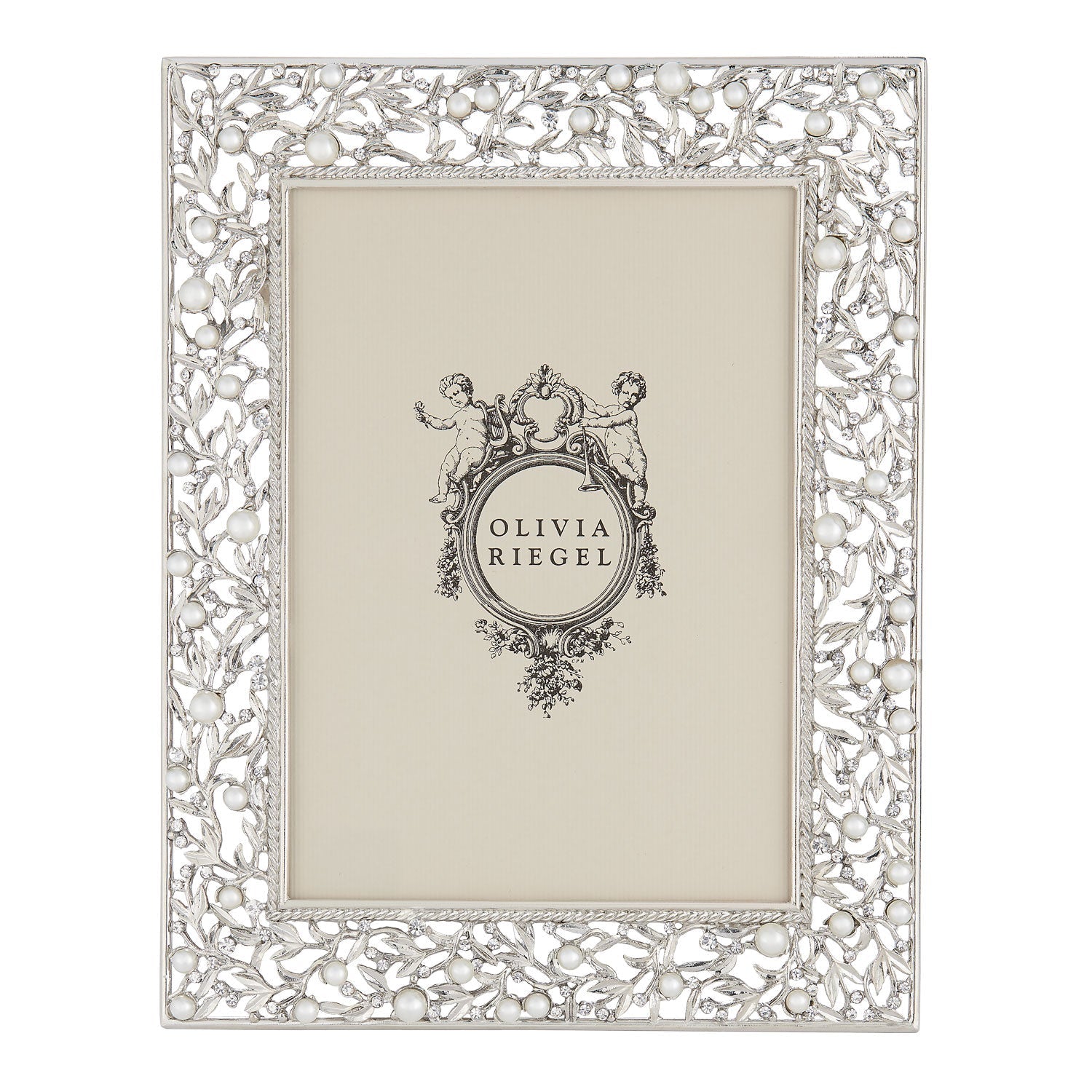 Gold or silver finished pewter picture frame, encrusted with hand-set clear European crystals and faux pearls. Elegant moiré silk back, with easel designed for vertical or horizontal placement. Tarnish resistant. Signature luxury gift box.