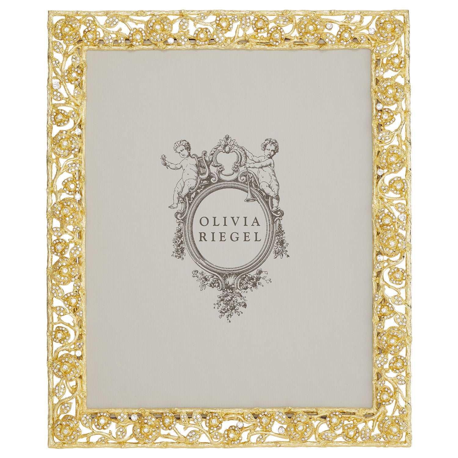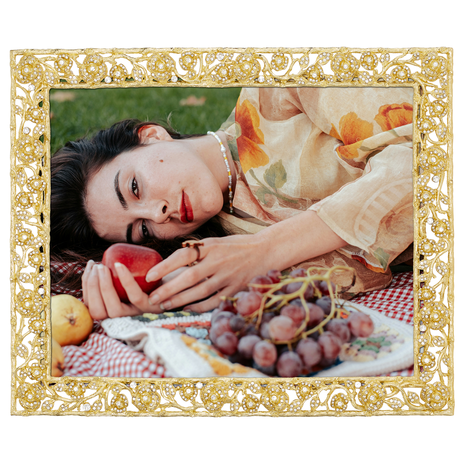Gold finished pewter climbing rose and trellis pattern, richly encrusted with hand-set clear European crystals. Elegant moiré silk back, with easel designed for vertical or horizontal placement. Beveled glass. Tarnish resistant. Signature luxury gift box included.