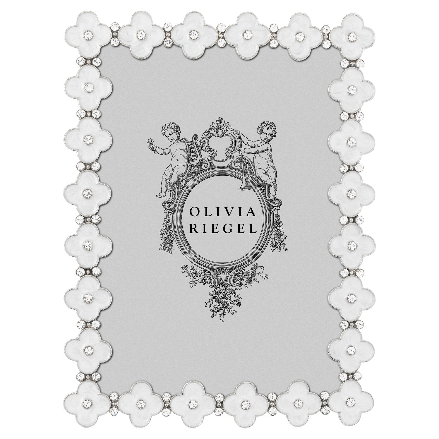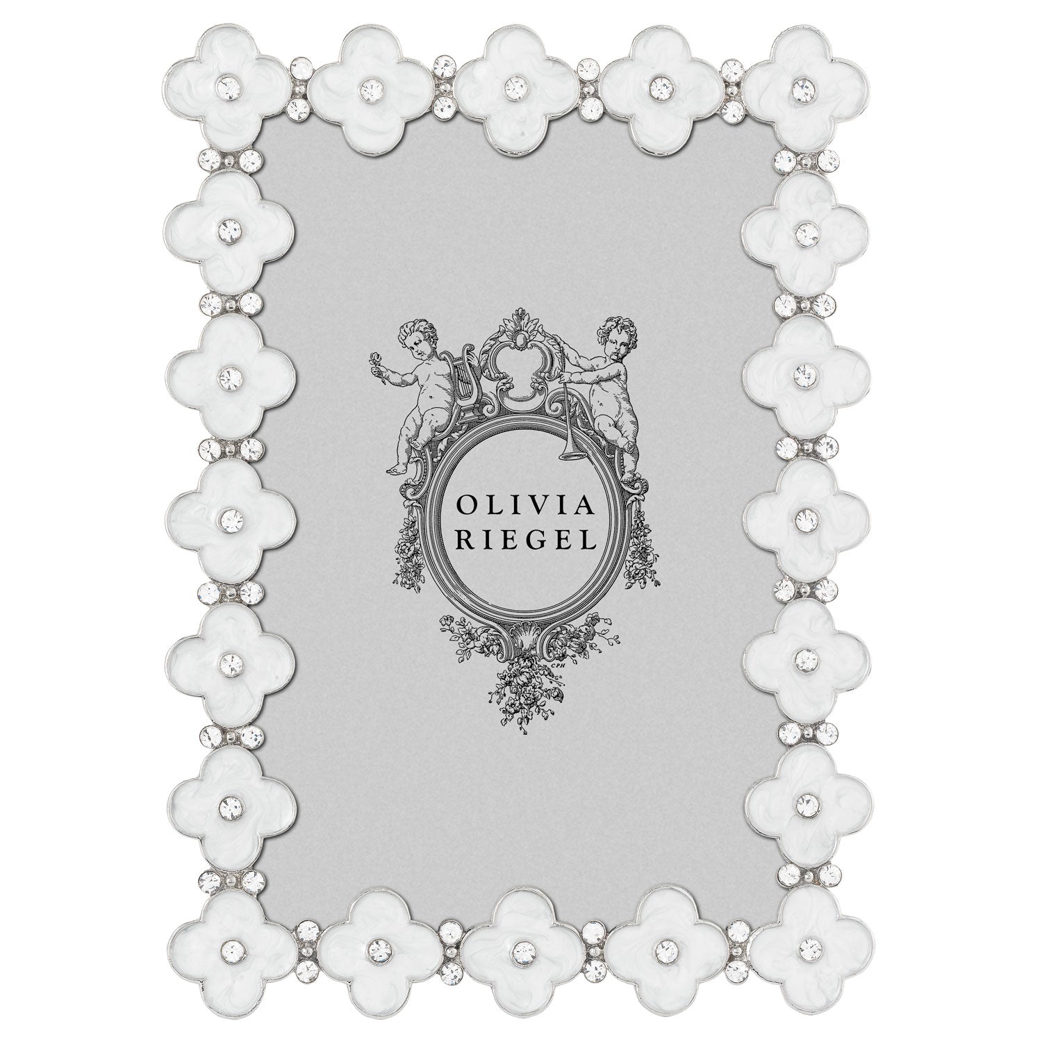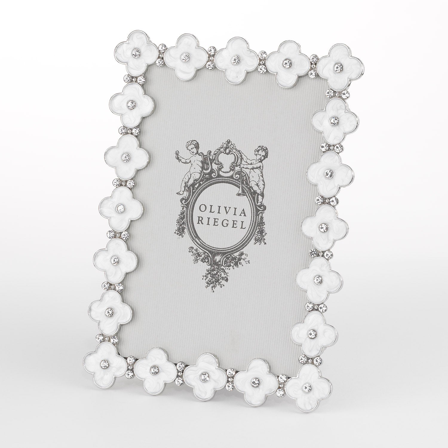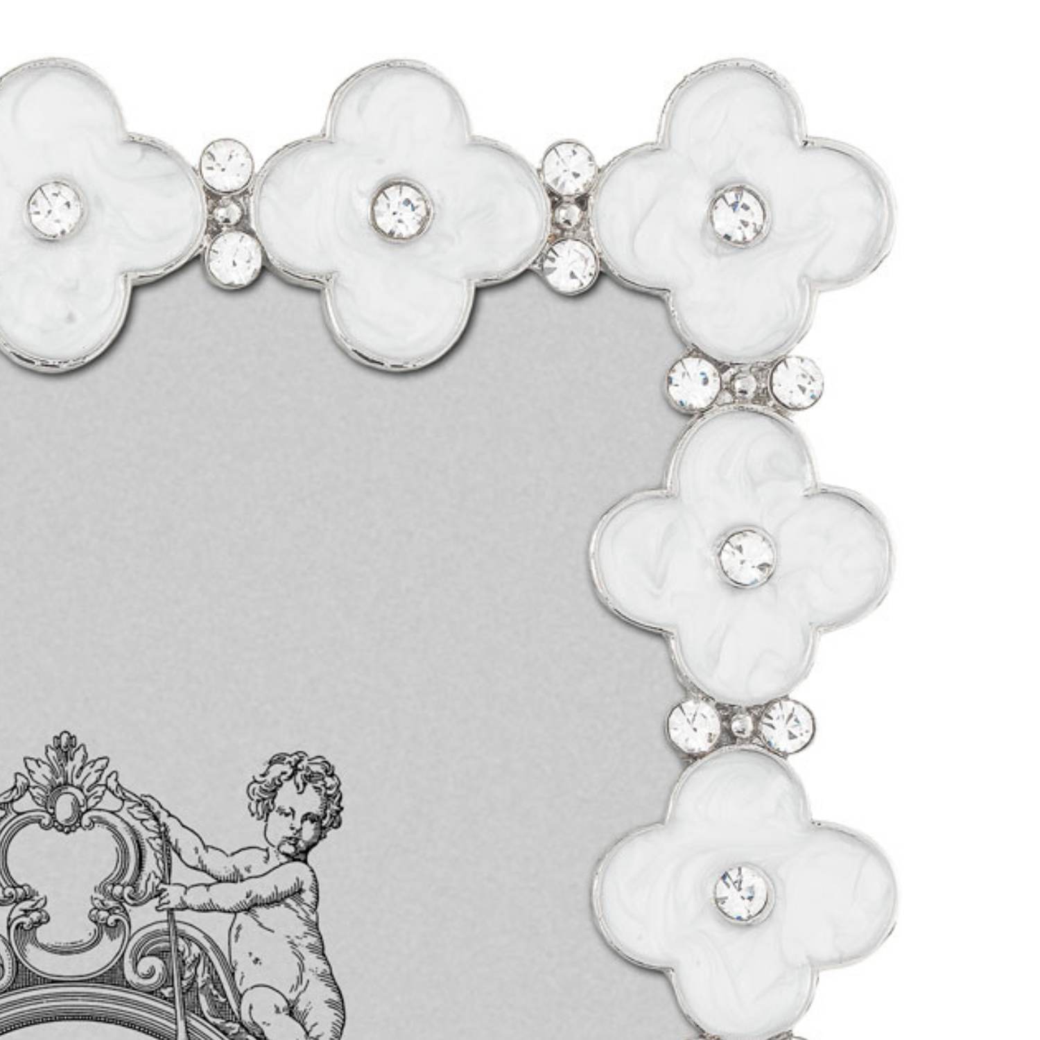 Inspired by the historic quatrefoil design—a decorative element utilized in architecture and the arts for millennia. Silver finished white-enameled pewter picture frame, adorned with hand-set clear European crystals. Elegant moiré silk back, with easel designed for vertical or horizontal placement. Tarnish resistant. Signature luxury gift box included.