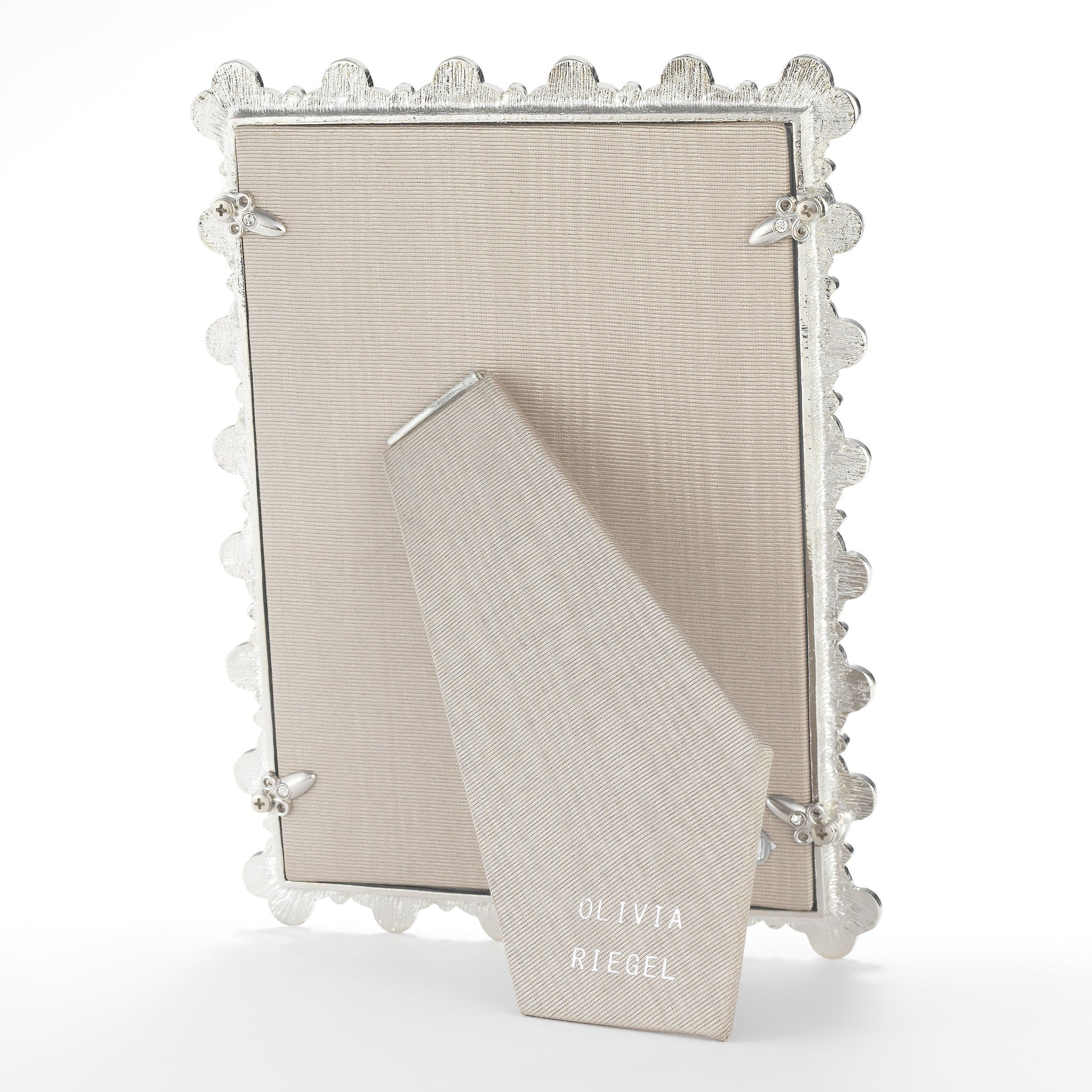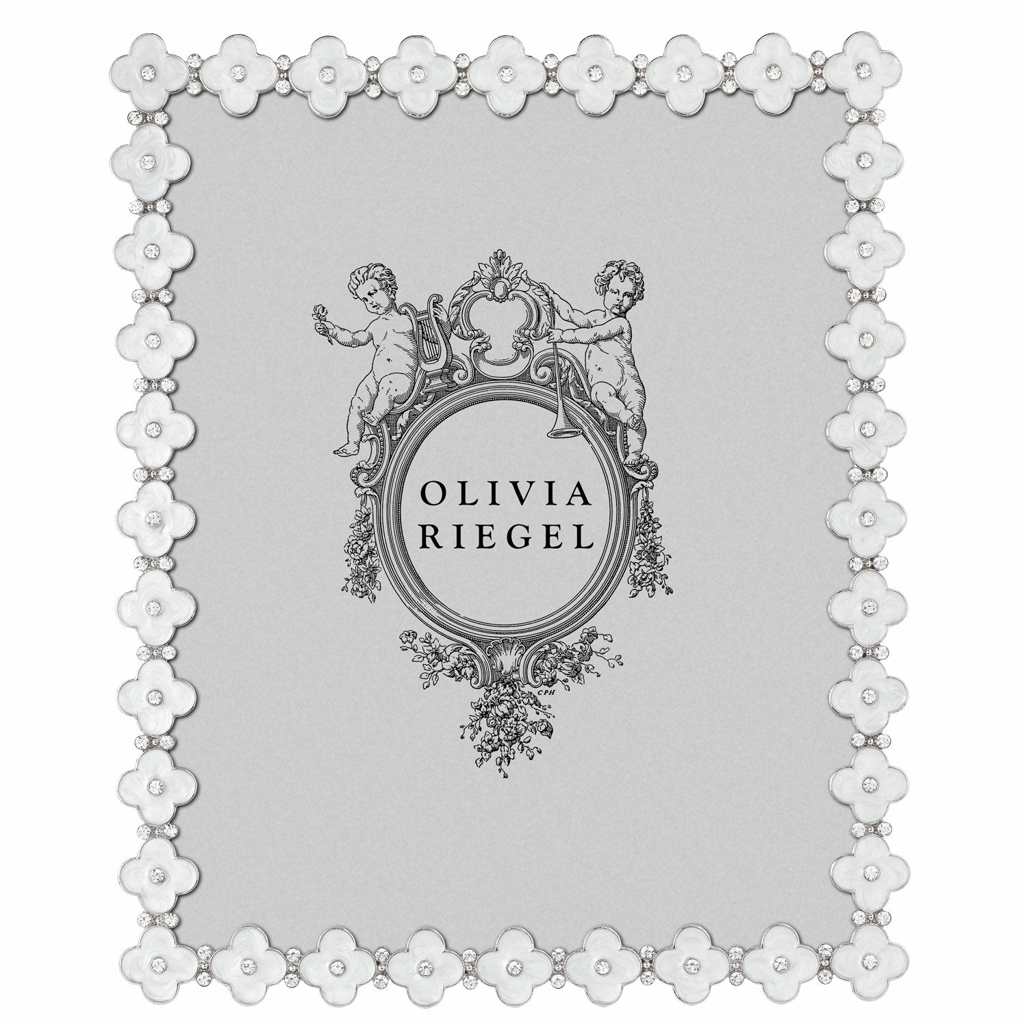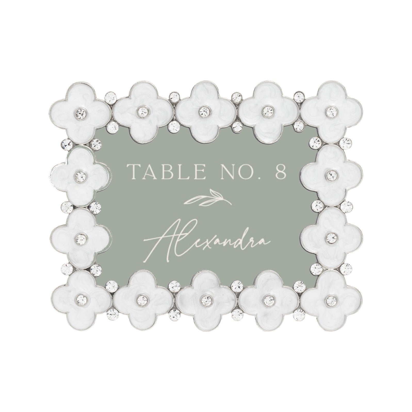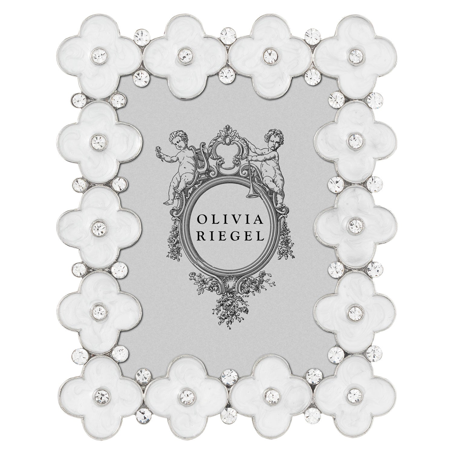 Inspired by the historic quatrefoil design—a decorative element utilized in architecture and the arts for millennia. Silver finished white-enameled pewter picture frame, adorned with hand-set clear European crystals. Elegant moiré silk back, with easel designed for vertical or horizontal placement. Tarnish resistant. Signature luxury gift box included.